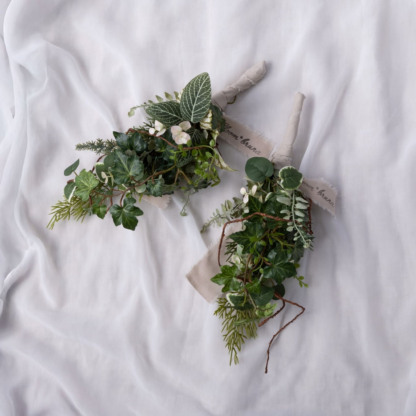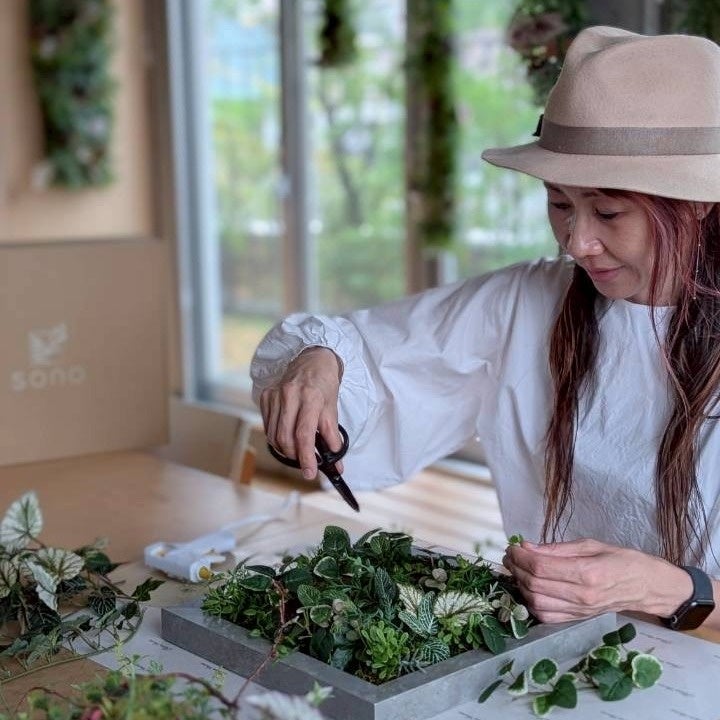 その答えとなったのが、2024年夏に出会ったフラワーデザイナー・Bloom*bruna 江尻チハル氏のボーダレスグリーンです。水やり不要でありながら、生きているような立体表現、影の落ち方まで計算された立体的な構成に強い共感を覚え、コラボレーションが始まりました。
