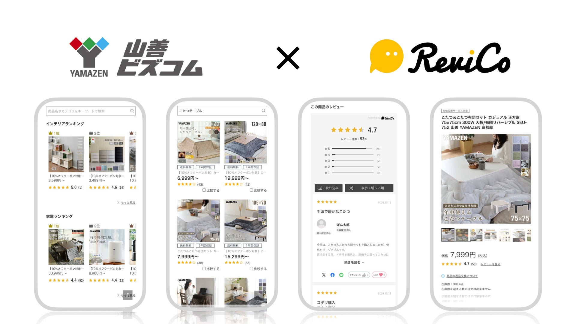 レビューマーケティングプラットフォーム「ReviCo」を提供する株式会社ReviCo(本社:東京都渋谷区、代表取締役:高橋 直樹、以下、ReviCo)は、株式会社山善(本社: 大阪府大阪市、代表取締役社長:岸田 貢司、以下、山善)のECサイト、「山善ビズコム」に、レビューマーケティングプラットフォーム「ReviCo」を提供開始したことをお知らせいたします。
