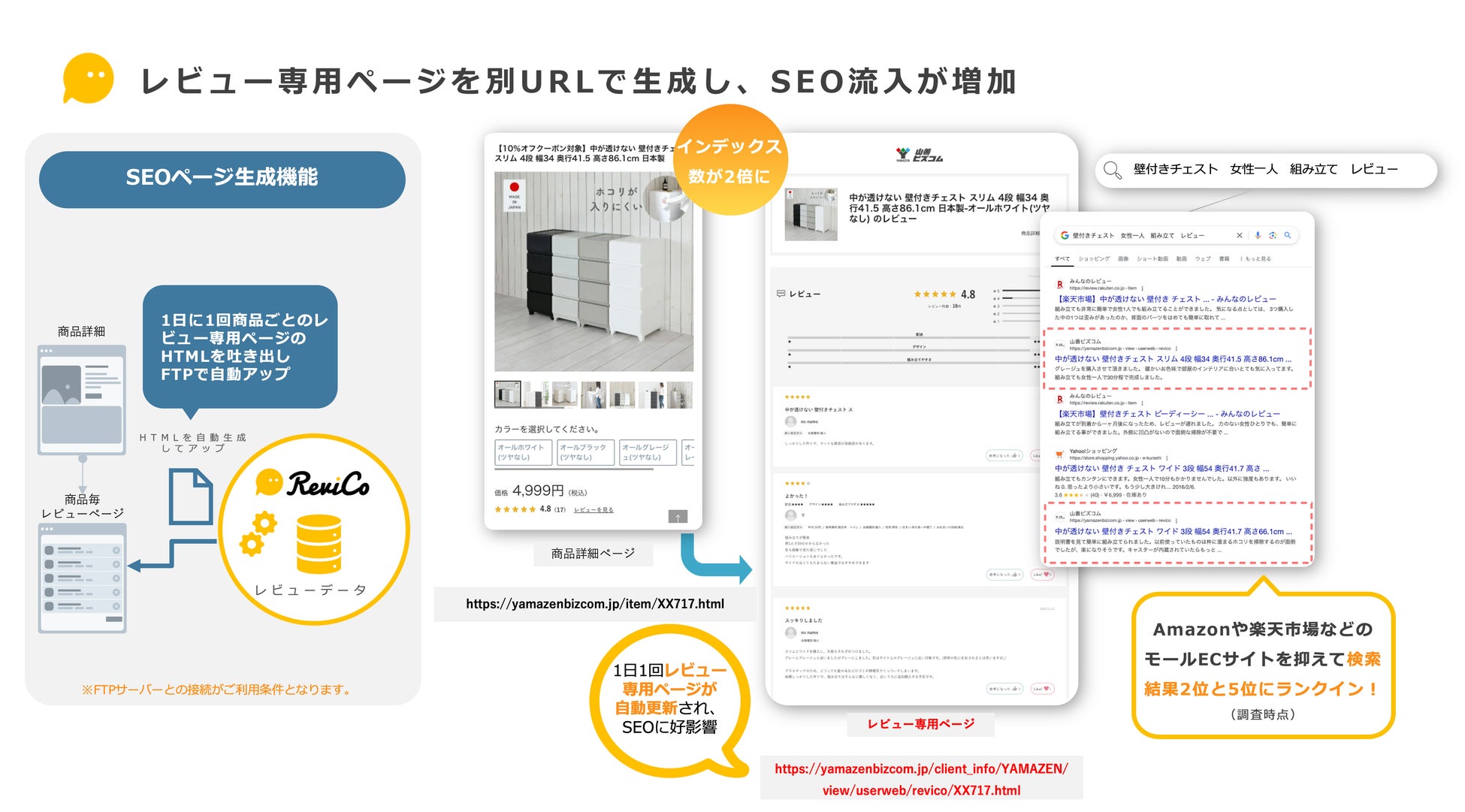 また、ReviCoのSEOオプションを利用することで、レビュー専用ページを別URLで生成し、インデックス数を2倍にしつつレビュー内のキーワードも検索対象とすることで、流入数の増加を実現しています。