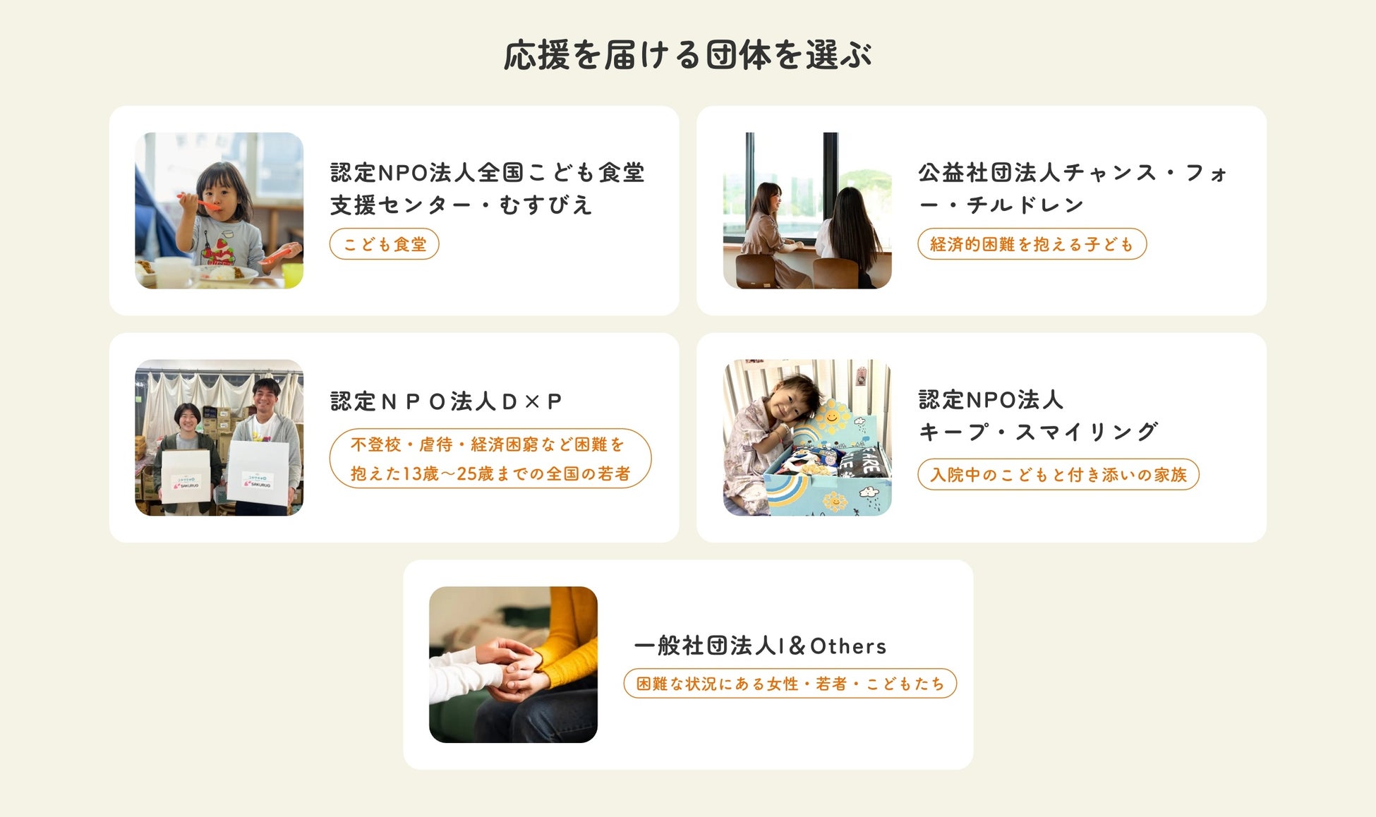 現時点、全部で5つの団体と連携しており、さまざまな困難の類型から、応援をお届けするこどもたちを選ぶことができます。
