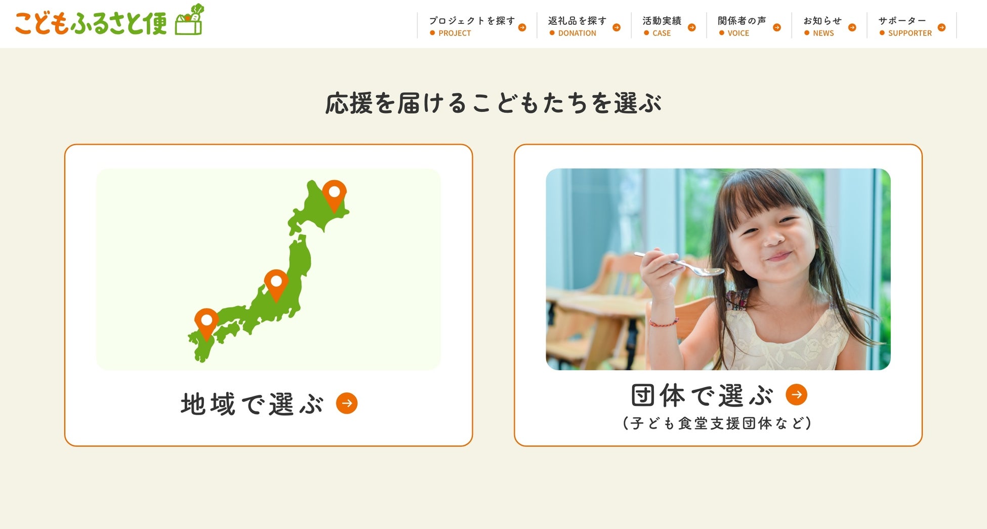 このたび開設した専用ポータルサイトでは、「どのこどもに応援品を届けるか」を、地域や団体から指定することができ、 これまでのふるさと納税よりも、より寄付者の想いを使いみちに込めることができます。