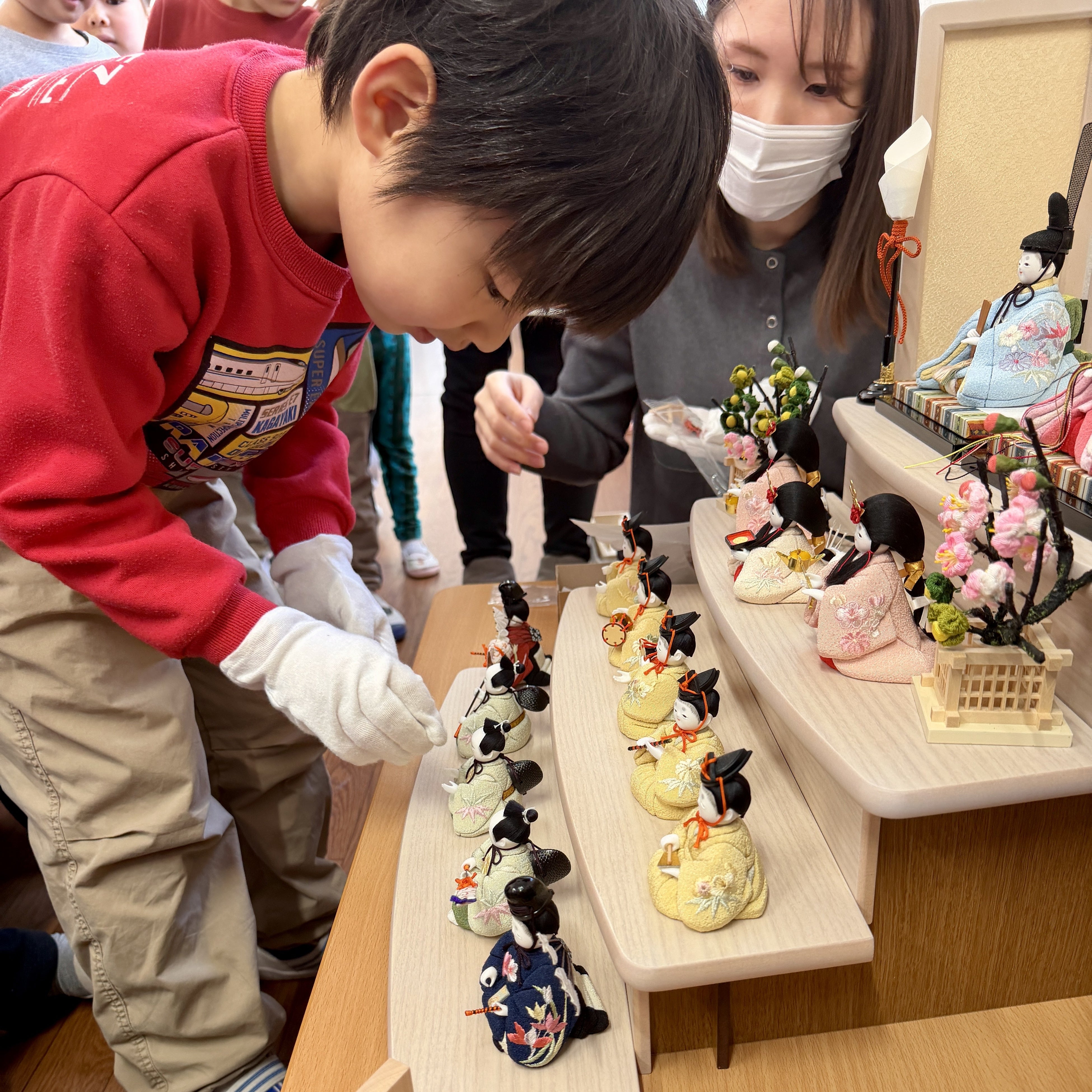 当日は、丁寧にご説明いただき、さらに子どもたちに設置のお手伝いをさせていただけたことで、皆とても嬉しそうにしておりました。実際にお雛様に触れながら学ぶことができ、貴重な経験になりました。その中でも、男の子たちの方が積極的に手を上げて参加していた姿が印象的で、思わず微笑んでしまう場面もございました。その反面、ヒヤヒヤもありました。