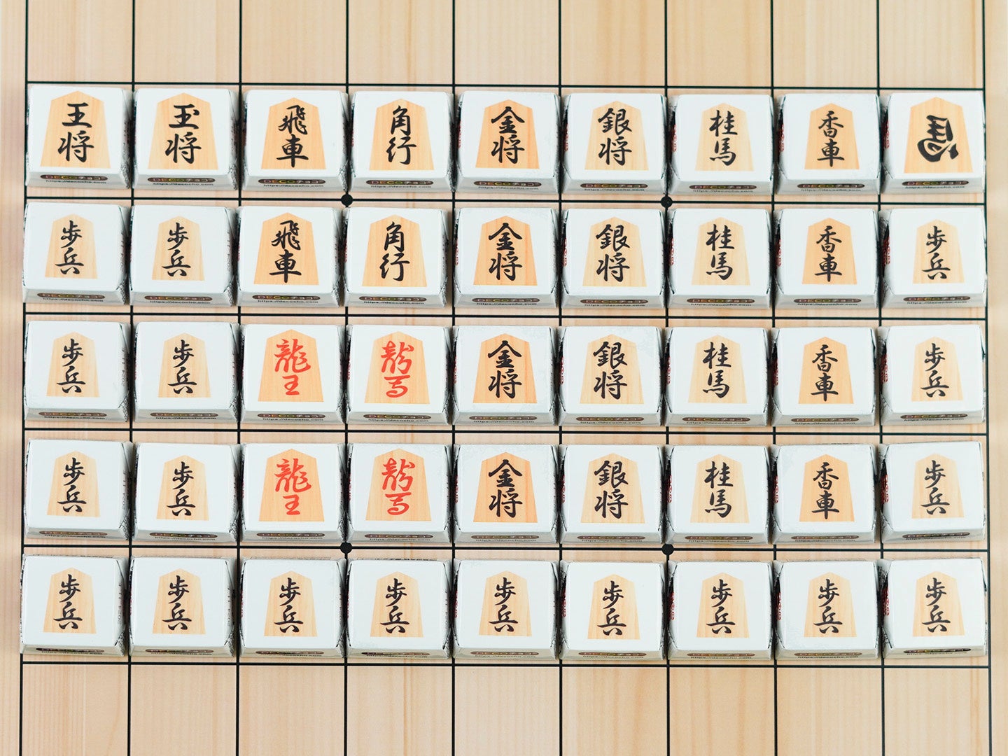 チョコ駒は一般的な将棋駒とほぼ同じサイズで、将棋盤に実際に並べて遊べます。