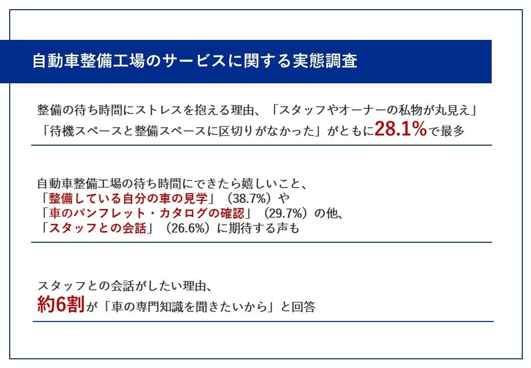 【自動車整備工場の利用者522名に調査】整備中の待ち時間にストレスを抱える理由、「スタッフやオーナーの私物が丸見え」「待機スペースと整備スペースに区切りがなかったこと」が同率1位の結果に