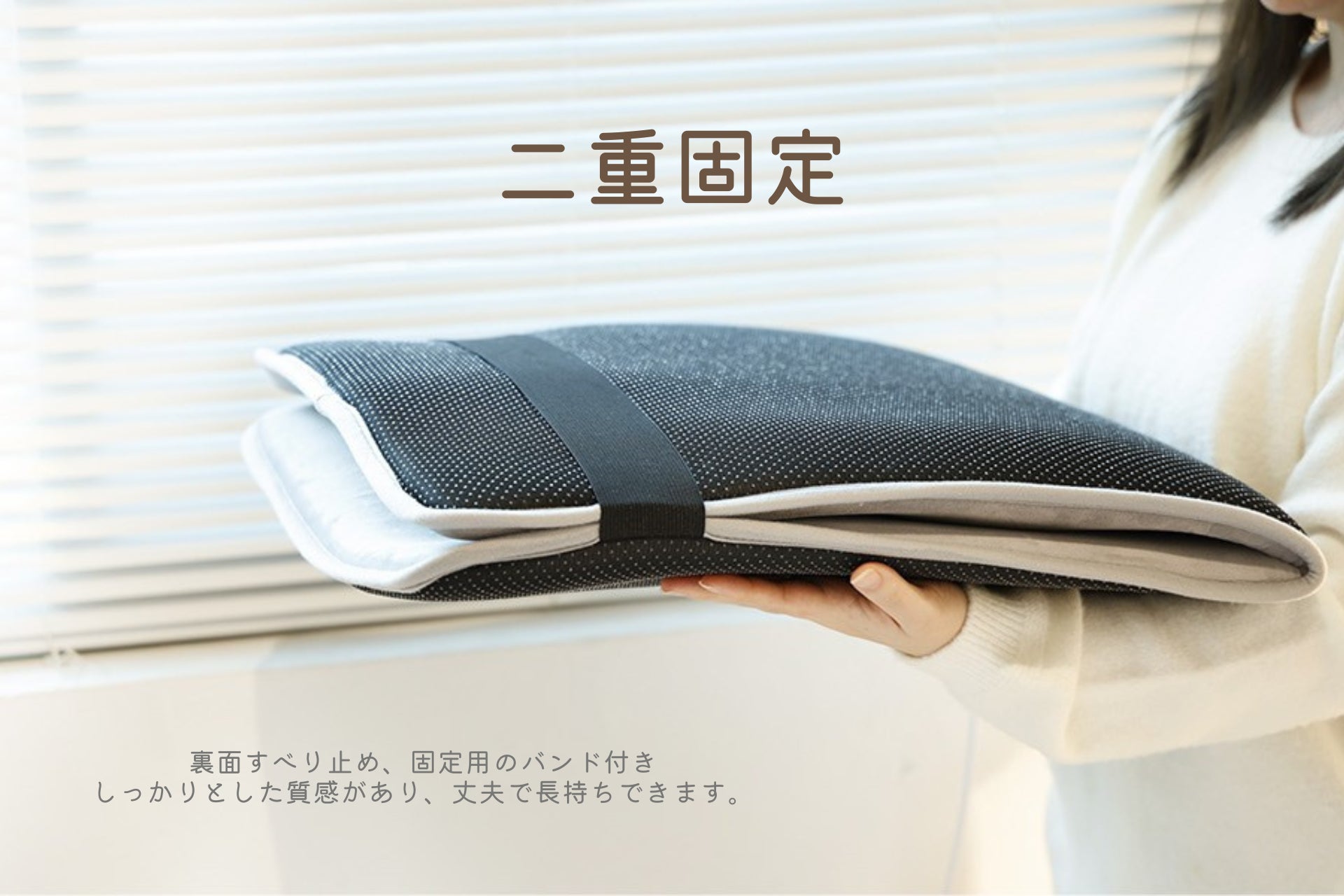 座布団の裏面にはシリコン製の滑り止め粒子を配置し、さらに強力な固定ベルトでしっかりと固定できます。