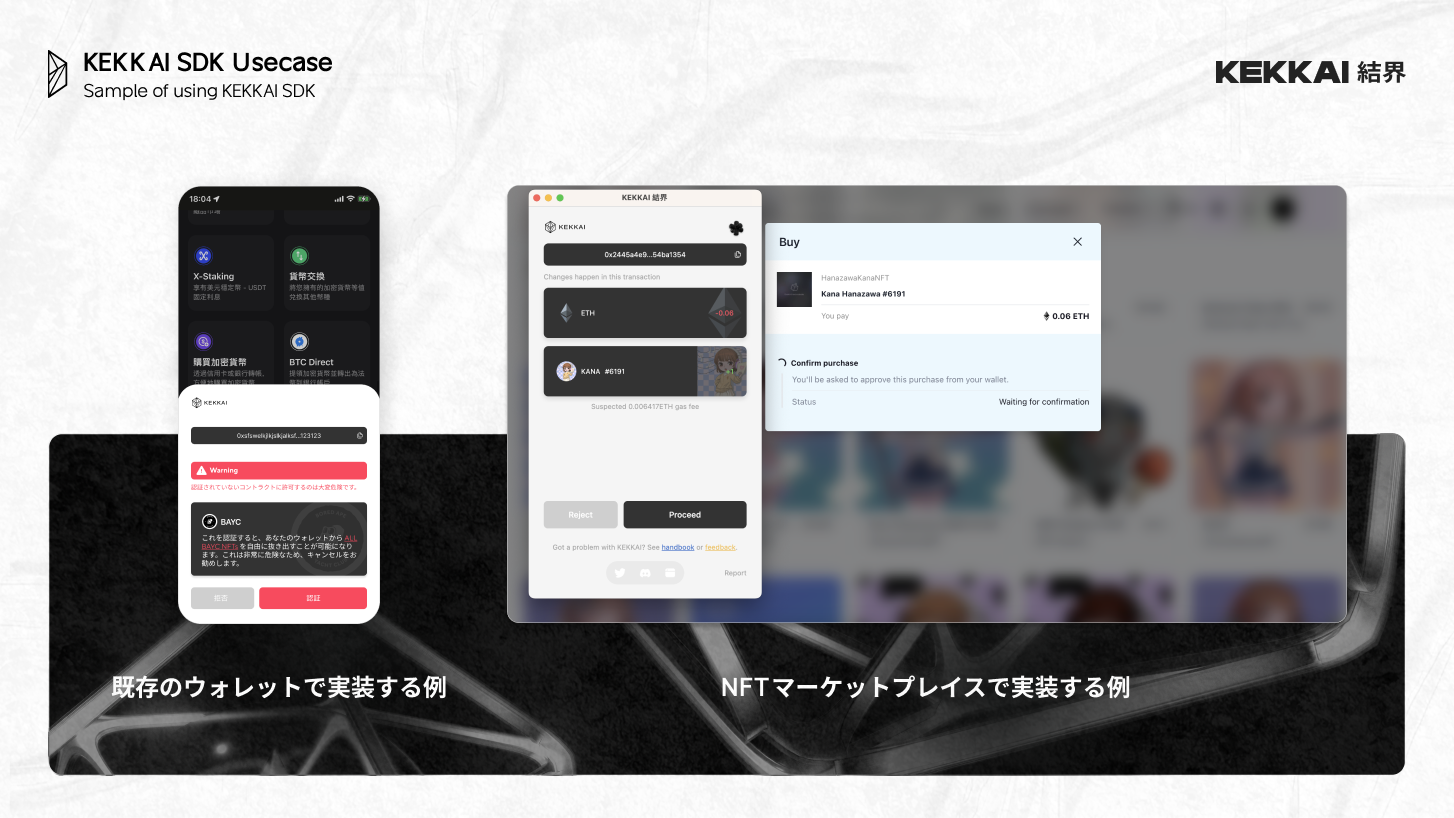 KEKKAI LABSでは、プロダクトのコードに脆弱性の有無をホワイトハッカーが調査分析する「KEKKAI Audit」と、すでに大手のウォレット開発会社にも導入済みで、数行のコードでウォレットセキュリティ機能を実装できる「KEKKAI API/SDK」を提供し、Web3業界全体のセキュリティ性向上に貢献してまいります。