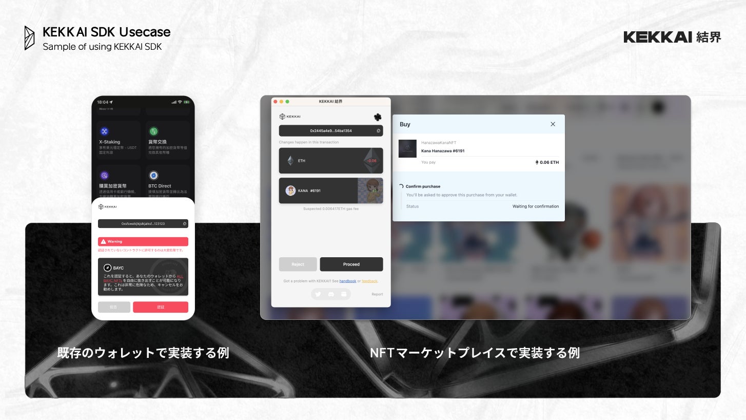 事業者向けにDappsのセキュリティ脆弱性チェックをする「KEKKAI Audit」と、PluginとMobileに搭載されているリスク検出機能パッケージ化した「KEKKAI API・SDK」を提供をしています。