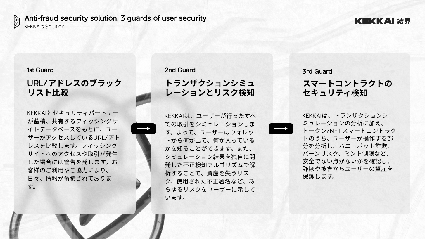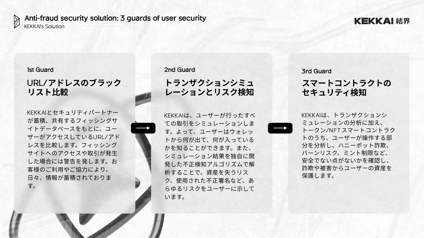 現在、ユーザー向けにトランザクションのシュミレーション分析により危険検知ができるPC専用Web3セキュリティツール「KEKKAI Plugin」、セキュリティ機能搭載ブラウザアプリ「KEKKAI Mobile」を運営中。