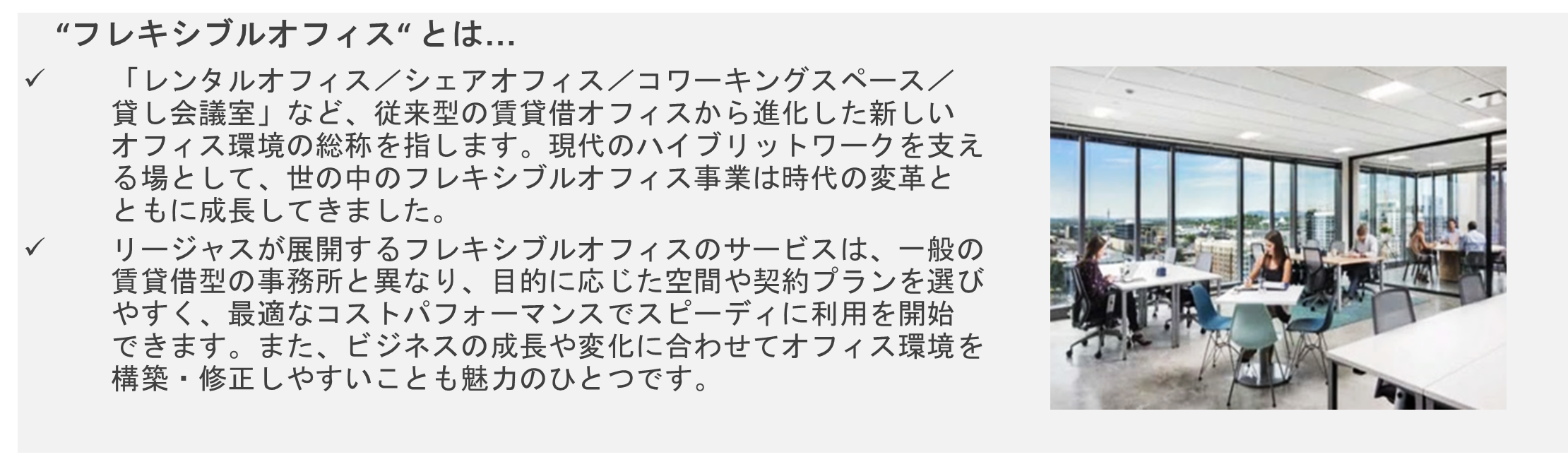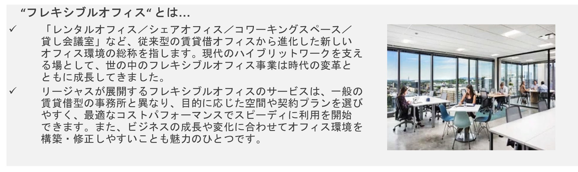 オフィス)」の4つのブランドを運営することで、多様なお客様のニーズにフィットするフレキシブルオフィス