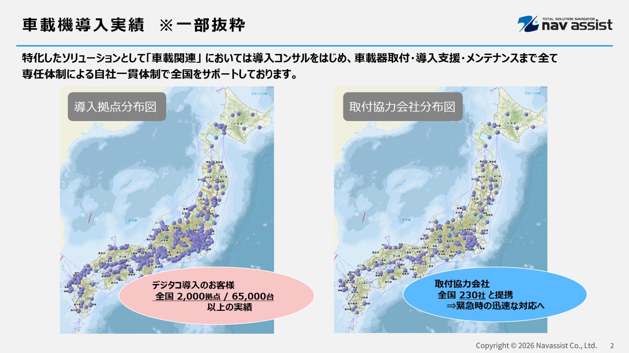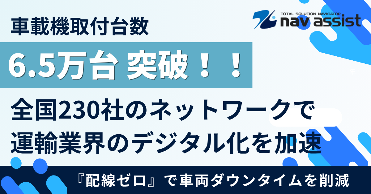 株式会社ナブアシスト(本社:群馬県前橋市、代表取締役:江口 大介、以下 ナブアシスト)は、デジタコ等車載機の取付実績が2026年3月時点で累計6.5万台を突破したことをお知らせします。同社は、デジタコの販売から取付、運用サポートまでを一貫して対応するワンストップサービスプロバイダーとして、運輸・物流業界のデジタル化推進を主導してきました。