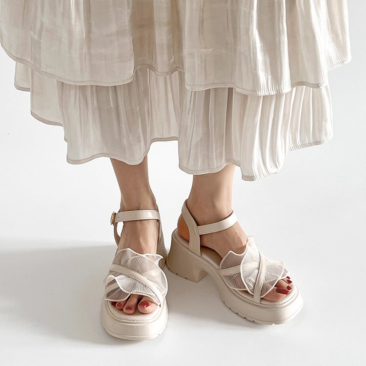「軽量厚底 チュール フリル ヒールソール サンダル 5985」は、そんなトレンド感を取り入れた一足。