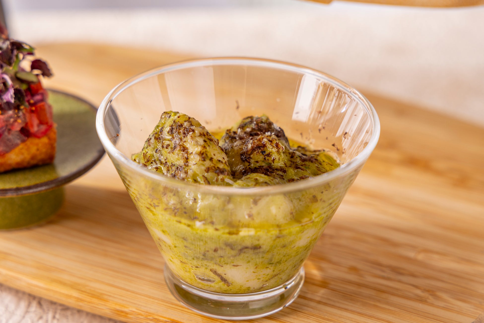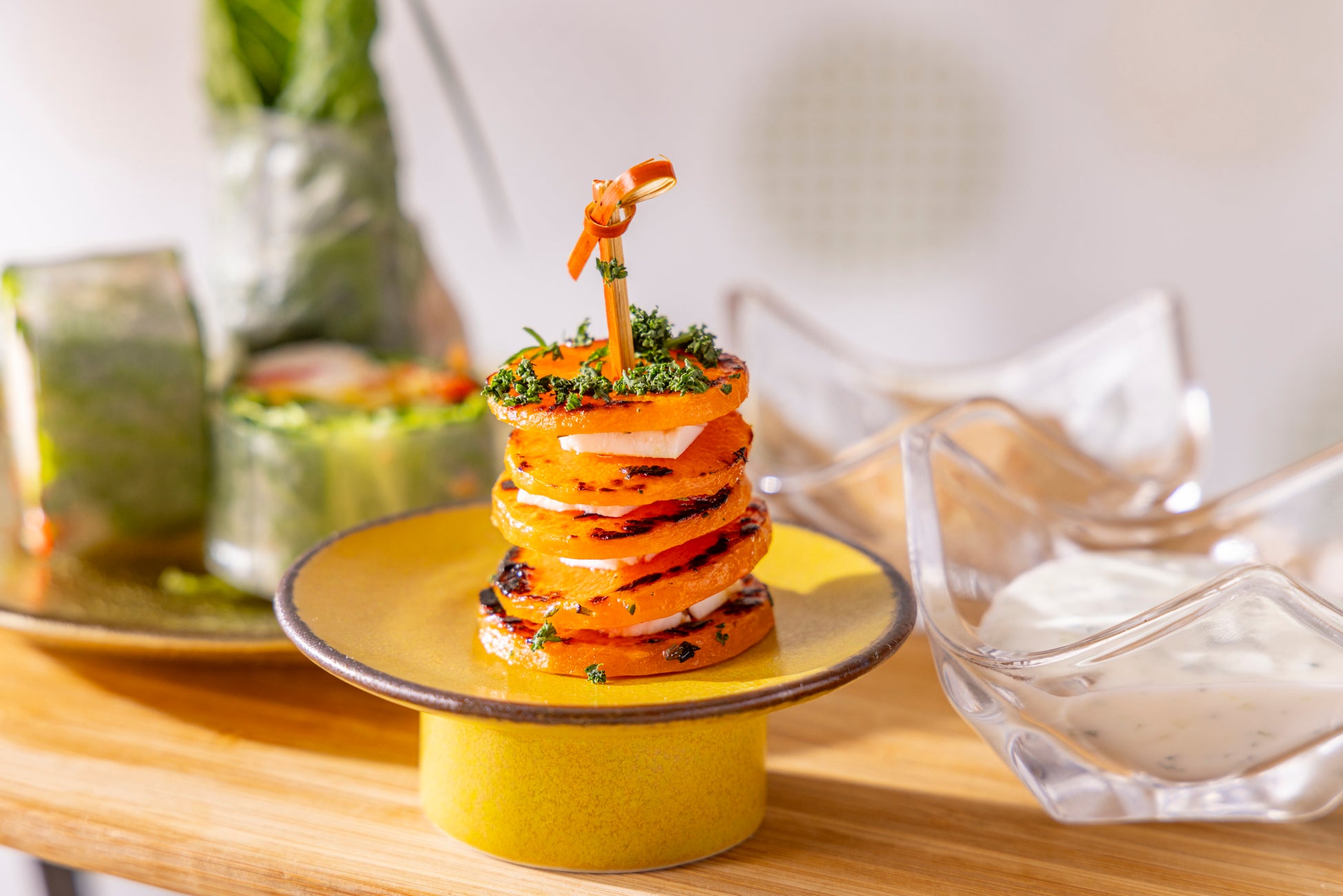 じっくり蒸し焼きにし、ほんのり甘味を引き出した地元のにんじんを酸味あるフェタチーズのアクセントが楽しめる一串。