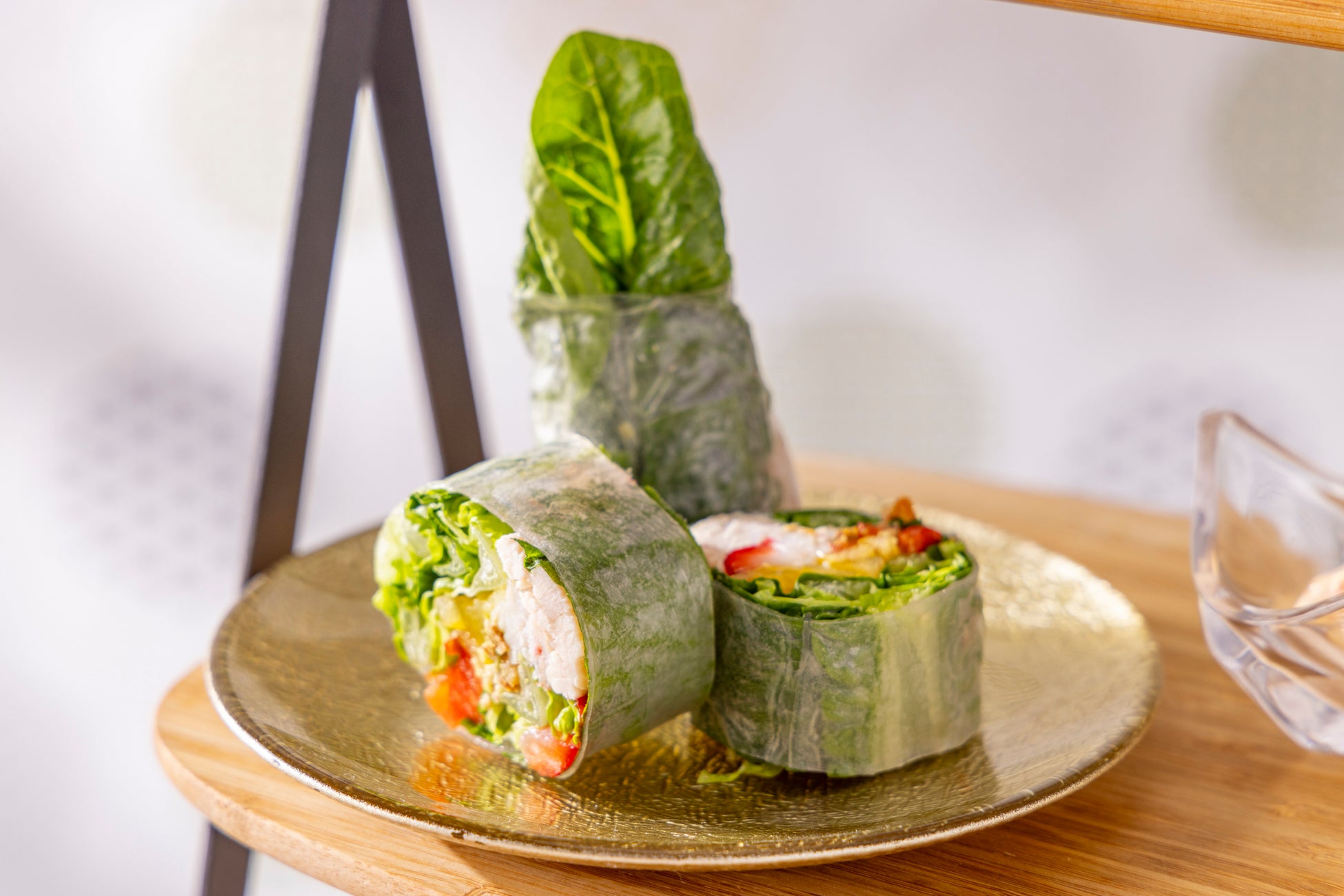 ネイバーフッドの季節野菜とリーフ、ズワイガニ、奥三河鶏ハムを包んだオリジナル生春巻き。一味をきかせた“はと味噌”マヨネーズ、飛騨ヨーグルト、ミント、岐阜柚子七味の2種のスパイスソースをディップしてさっぱりと。