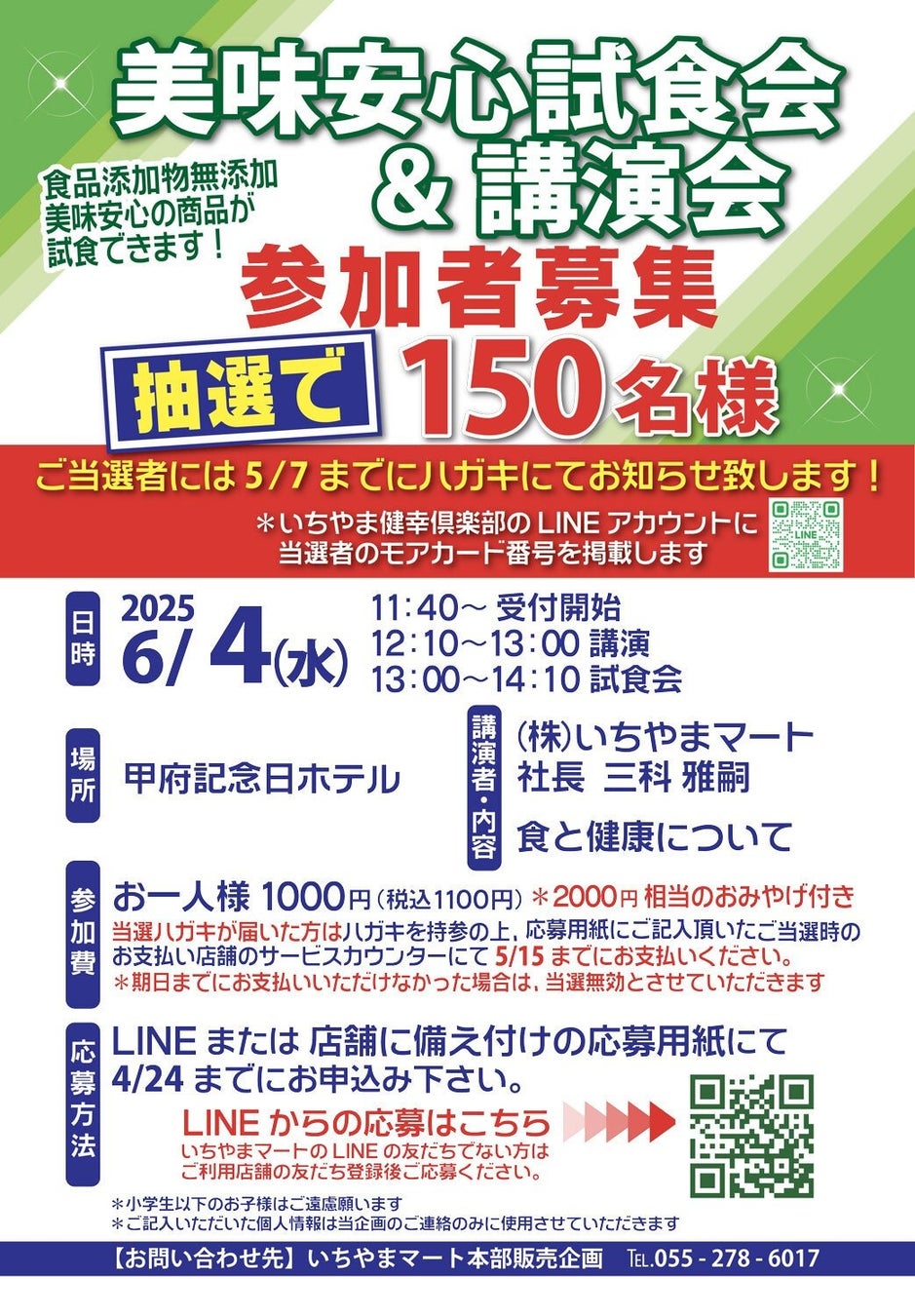 株式会社いちやまマート(本社:山梨県中央市 代表取締役:三科雅嗣)は、2025年6月4日(水)、山梨県甲府市にある甲府記念日ホテル(甲府市湯村)において、第33回美味安心試食会&講演会を開催いたしました。