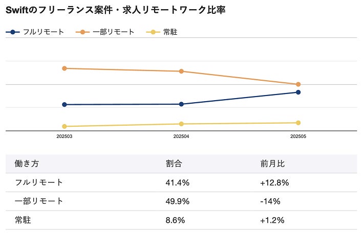 Swift案件のフルリモート割合(41.4%)は前月比+12.8%と大幅に増加しましたが、依然として一部リモートが過半数を占めています。
