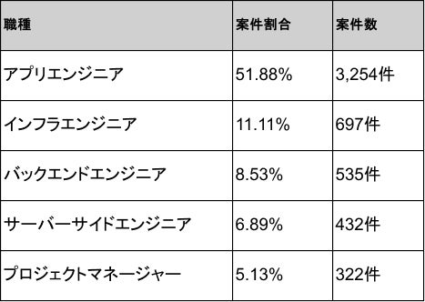 職種別ではアプリエンジニア51.88%(3,254件)、インフラエンジニア11.11%(697件)、バックエンドエンジニア8.53%(535件)が中心で、VaporによるAPI実装やFastlaneでの自動化などモバイルとサーバーを横断する案件が増加しています。
