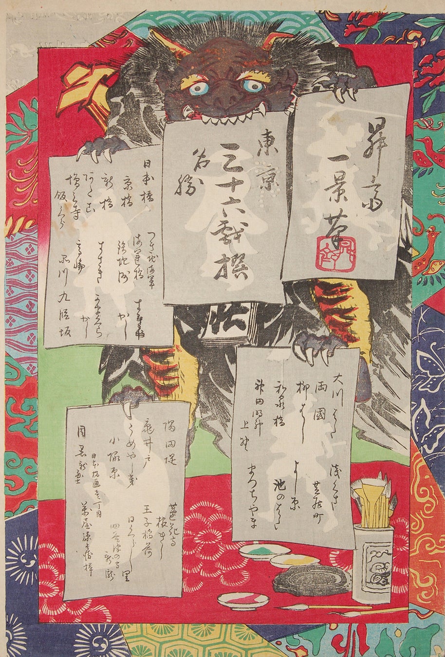 昇斎一景は、明治3〜7年という短い活動期間に、東京の名所絵や明治風俗を滑稽に描いた戯画を手掛けました。「東京名所三十六戯撰」は東京の名所を舞台に、近代化の中で変化する暮らしや町の様子を、人々のユーモラスな姿と共に描いた人気シリーズ。本展では、表紙を含め7作品展示いたします。