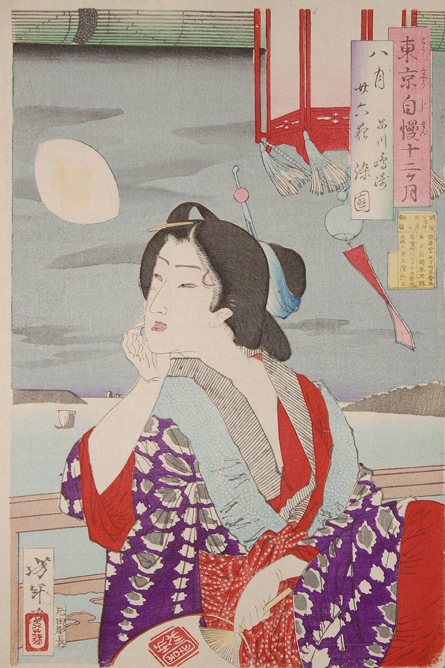 歌川国芳の門人で明治時代に活躍した月岡芳年の作品「東京自慢十二ヶ月」シリーズより。優美な女性を描き出した作品からは、明治時代らしい赤や紫を散りばめた色彩感覚や当時の風俗も垣間見れます。本展では芳年人気シリーズ「月百姿」からも1点展覧いたします。