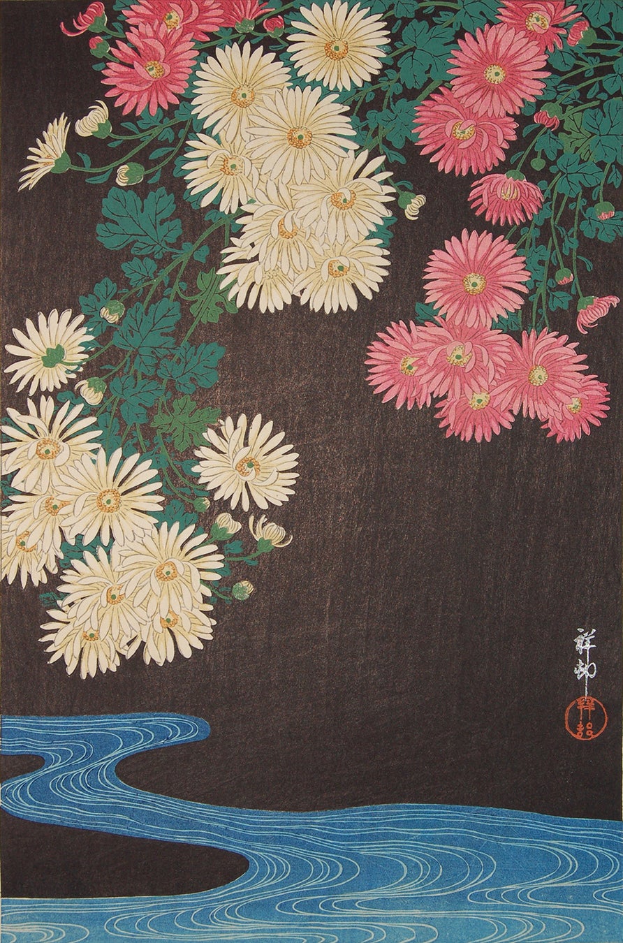 浮世絵の技術は、大正期に入り「新版画」と呼ばれる新しい木版画運動につながっていきます。小原古邨は、花鳥画の分野に活躍し、繊細な描写と色彩が注目される絵師です。「柘榴と鸚鵡」では、羽の一枚一枚に絵の具をつけずに馬連で摺ることで凹凸を施す、浮世絵以来の「空摺り」の技法によって、無色の細かな凹凸が施されています。これらの作品では新版画の優れた木版技術を垣間見ることが出来ます。