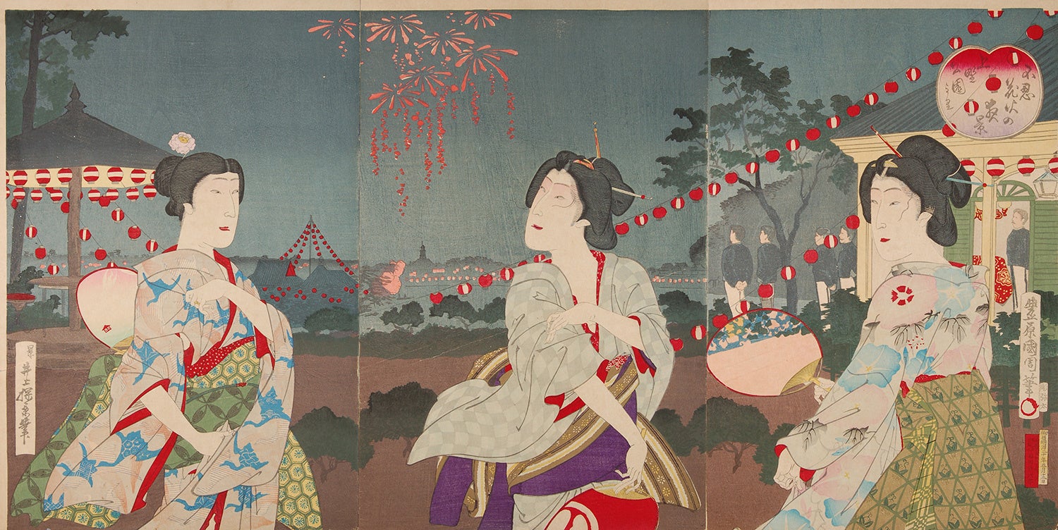 豊原国周の「上野公園より不忍花火の夜景」は、明治9年に上野公園内に建てられた西洋料理店「上野精養軒」の庭で不忍池から上がった花火を眺める3人の女性を描いたものです。左の女性は伝統的な日本髪に対して「束髪」と呼ばれた新しいスタイルに花の髪飾りをさしています。左手の指には指輪をしていたり、画面の右奥では洋装の男性たちもうかがえて、様変わりしていく最中の当時の装いを見ることができます。