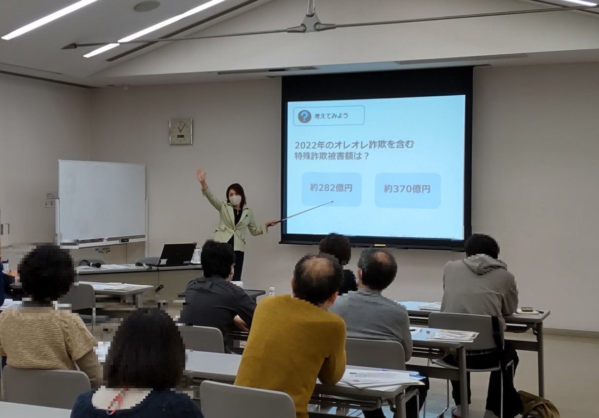 ほぼ全員の方が正解の選択肢を選びましたが、講師はこう続けました。「正解も驚きの額ですが、実は、もう一つの数字は前年の特殊詐欺の被害額です。みんなで警戒していているにもかかわらず、1年で約88億も増えました。この2年を合計しただけでも約650億にもなります。」 この数字の「見える化」には、ご参加の皆様も驚いたご様子でした。