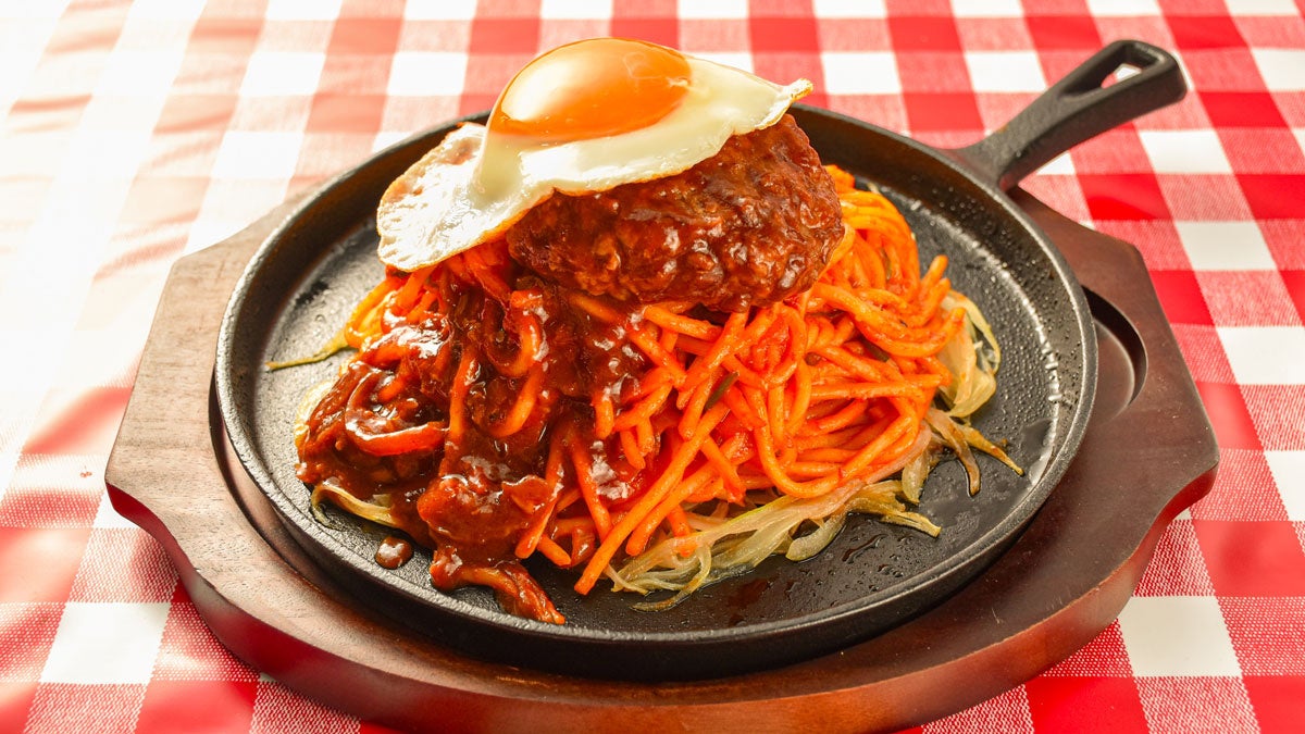 鉄板スタイルには熱々のトッピングがおススメです。ナポリタンなら「鉄板ナポバーグ」に目玉焼きを、ミートソースなら「鉄板ミートカツ」にチーズトッピングを。トッピング&大盛り無料の満足感にさらにトロトロ熱々がプラスされますよ!