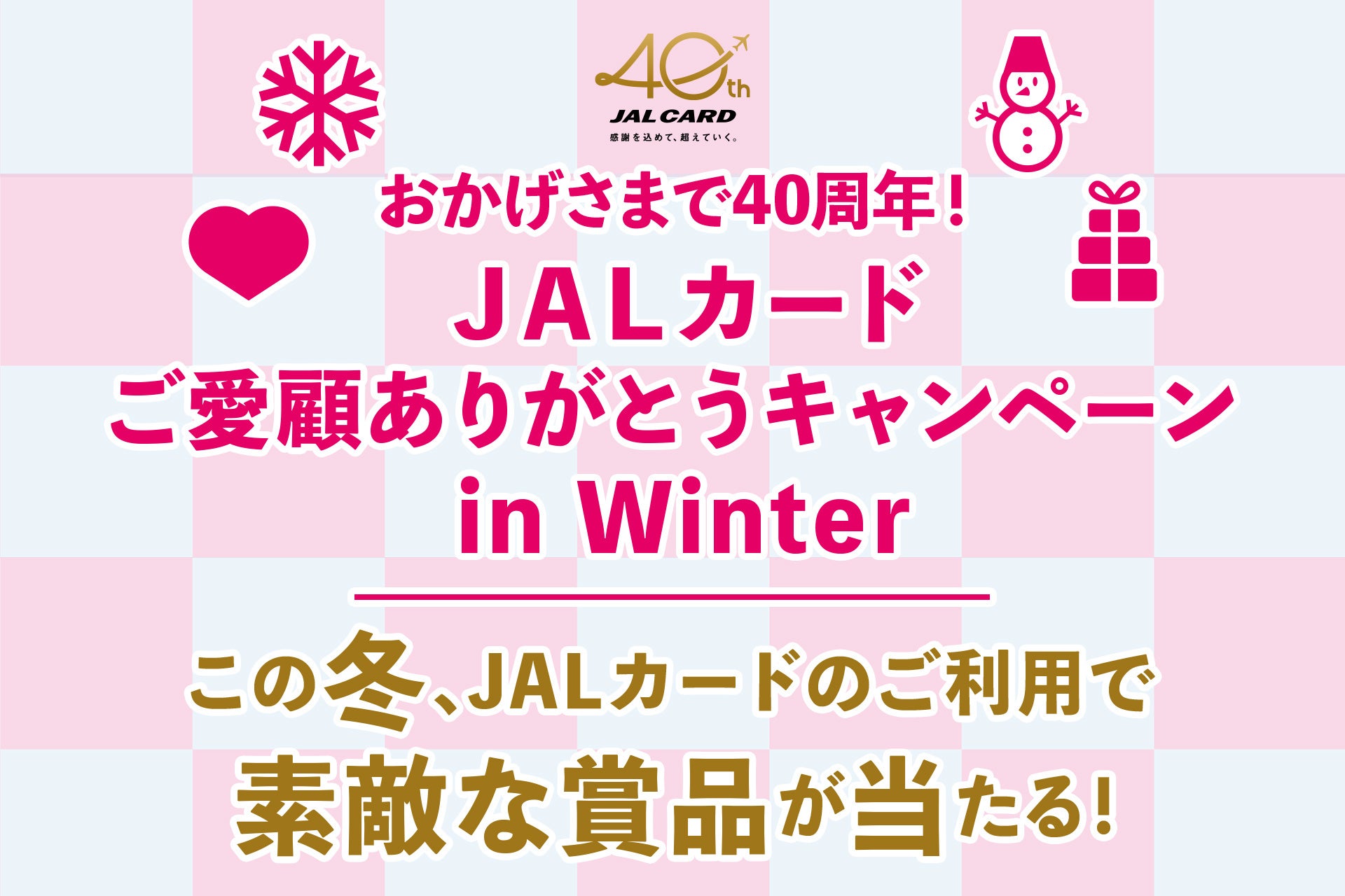 株式会社ジャルカード(本社:東京都品川区、代表取締役社長:西畑 智博)は、2024年10月に創立40周年を迎えました。これまでご愛顧いただいているお客さまへ感謝の気持ちを込めて、総勢270名様に限定グッズやオリジナルバスツアーなどの豪華賞品が当たる「JALカードご愛顧ありがとうキャンペーン in Winter」を2025年1月6日(月)より実施しております。