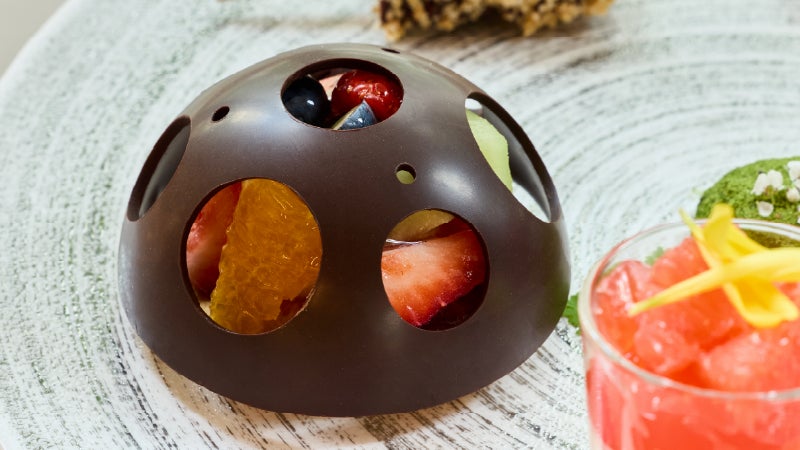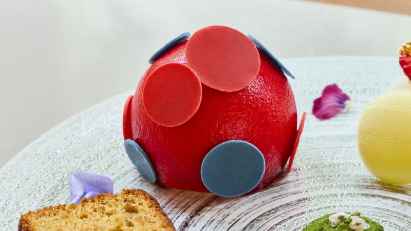 マンゴーの甘く濃厚な香りが口の中で広がり、赤すぐりの酸味がアクセントに。滑らかなバニラムースと、艶やかなフランボワーズのグラサージュを重ね、仕上げに赤と青のドット柄チョコを飾った、万博のキャラクターを彷彿とさせるスイーツです。