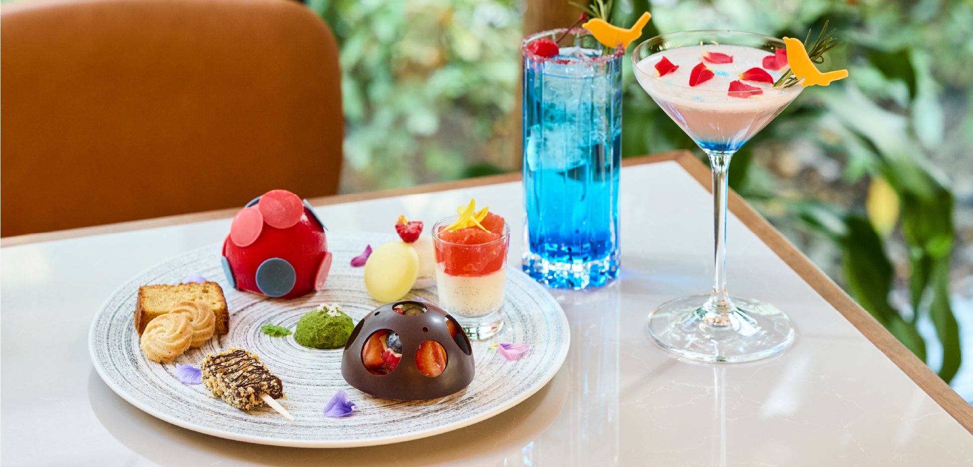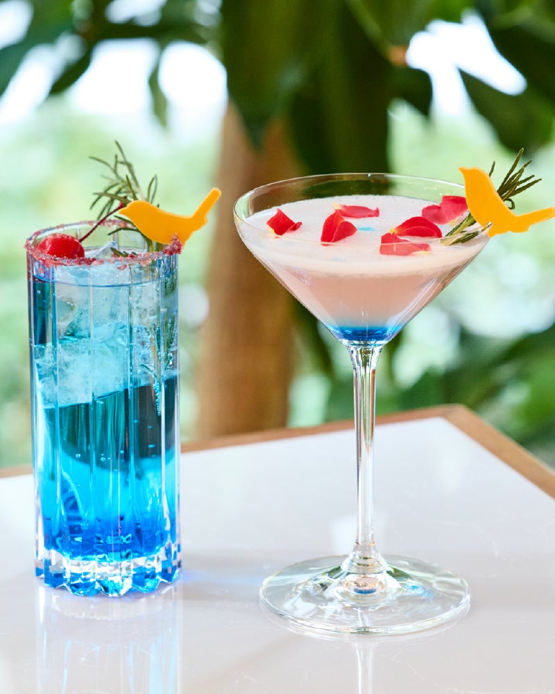 セットのドリンクは、バラのシロップとジンを合わせたピンクカラーのカクテル「ホトリア」と、ライチの甘みとグレープフルーツの酸味が調和した爽やかなブルーモクテル「アクアネイチャー」(ノンアルコール)から、お好きな1杯をお選びいただけます。