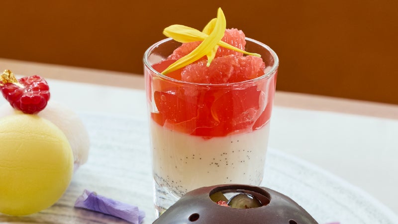 とろけるパンナコッタに、太陽の光を閉じ込めたようなブラッドオレンジのジュレを重ね、みずみずしいピンクグレープフルーツを贅沢に飾ったグラススイーツ。パンナコッタの優しい甘さ、ブラッドオレンジの爽やかな酸味、そしてグレープフルーツのほろ苦さのハーモニーと繊細な味わいをお楽しみください。
