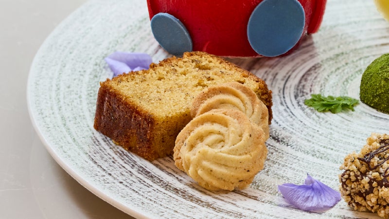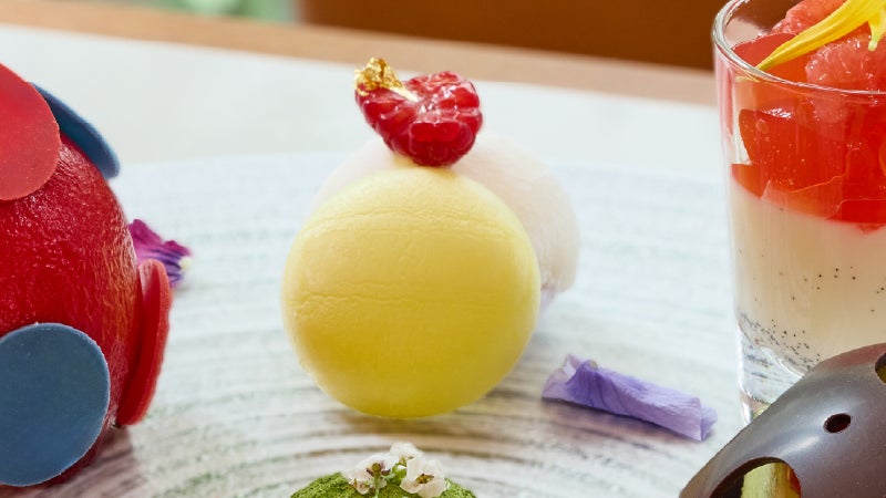 万博の会場に見立てた丸いプレートに並ぶ7種のスイーツ。赤と青のドット柄が特徴の「パビリオンサマームース」をはじめ、新感覚スイーツ「ショートケーキ大福」や柚子と抹茶の風味を味わえるパート・ド・フリュイ「静かな森のゆずジュエル」など、万博をイメージしたスイーツが揃います。