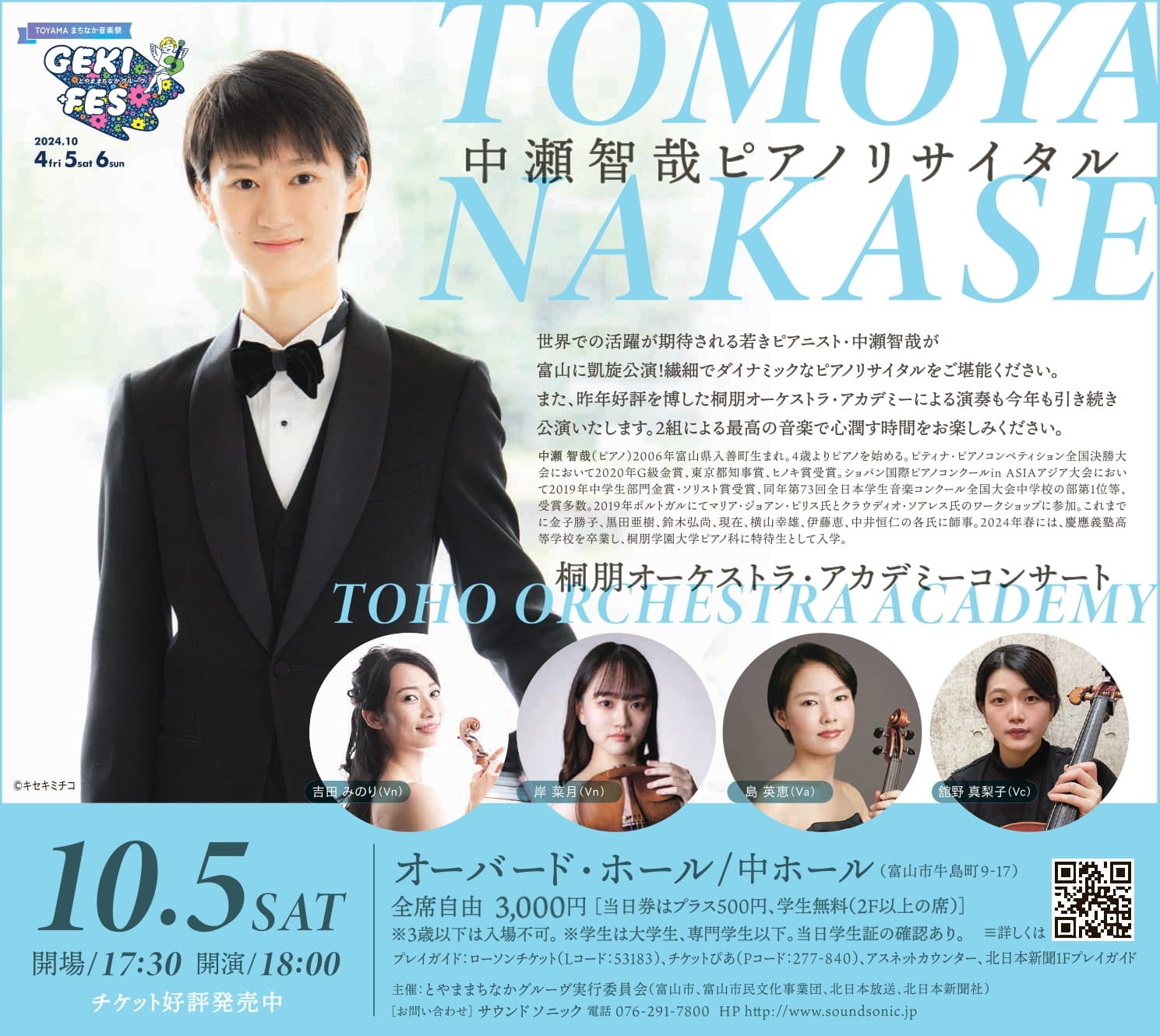 株式会社北日本新聞社(本社:富山市)などでつくるとやままちなかグルーヴ実行委員会は、10月5日にオーバード・ホール 中ホールで、若き才能たちの美しい調べが楽しめる「中瀬智哉ピアノリサイタル/桐朋オーケストラ・アカデミーコンサート」を開催します。