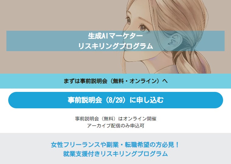 生成AIをマーケティングの現場で活用するための実践的なスキルを取得していただき、あわせて生成AIを活用したい企業とのマッチングの場も創出する一連のプログラムを通じて、両社で生成AI領域での女性の新たなキャリア支援を行なってまいります。