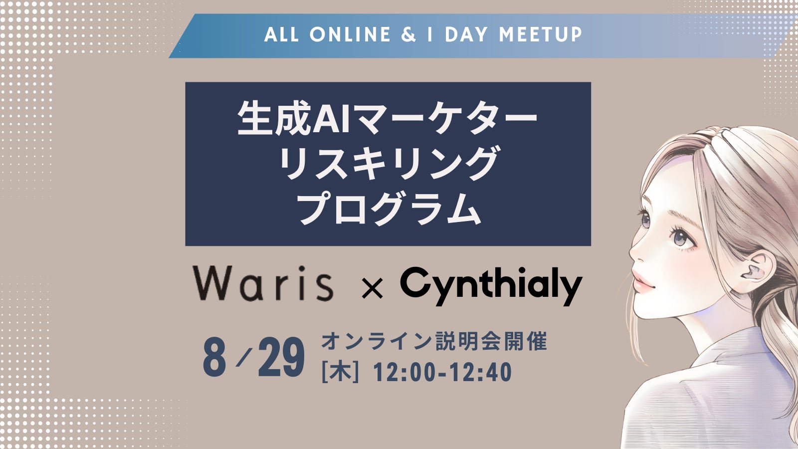 法人向けの生成AI人材育成・導入変革支援を行うCynthialy株式会社(所在地:東京都渋谷区、代表取締役:國本知里、以下Cynthialy)と、女性の多様な働き方への支援を通じて、すべての人の自分らしい人生を応援する人材サービス企業株式会社Waris(所在地:東京都千代田区、代表取締役:米倉史夏、田中美和、河京子、以下Waris)は、女性向けの「生成AIマーケターリスキリングプログラム」を共同提供し、本日より受講者の募集を開始いたします。