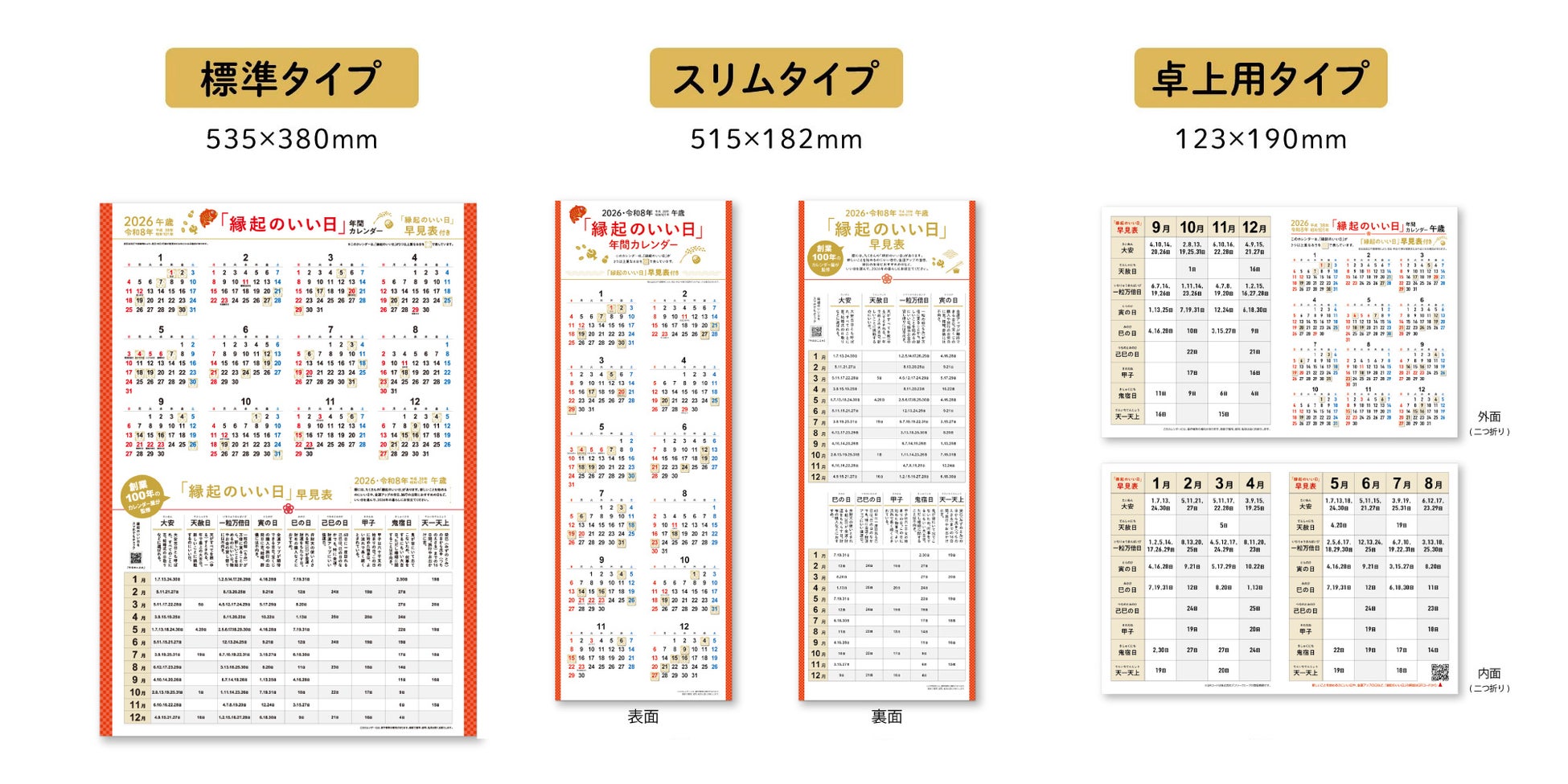 また、新日本カレンダーでは、現在販売中の2026年版のカレンダー商品に、特別付録として「縁起のいい日 年間カレンダー」を付けてご提供しています。