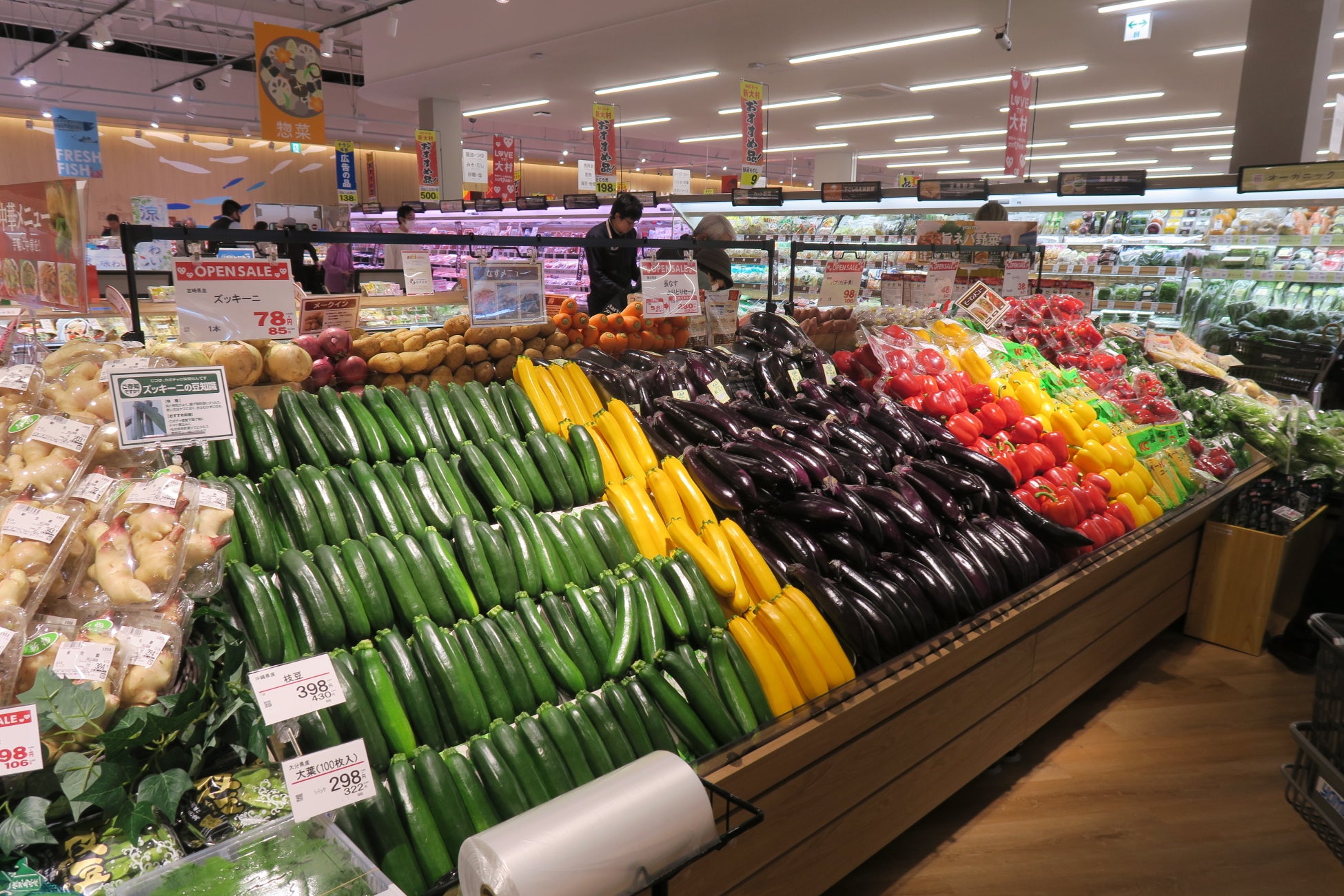 ・青果売場では、地元企業の㈱村上農園とコラボした新鮮なサラダを導入するなど、地元で採れた新鮮・安全な野菜や旬の果物を種類豊富に揃えます。鮮魚売場では、下処理いらずで時短・便利な商品をご用意するほか、調理の下ごしらえや料理方法の相談にも丁寧にご対応します。また、精肉売場では、和牛など焼肉商材のコーナー化、即食のおつまみやローストビーフなど、品質にこだわった商品をお求めやすい価格でご提供します。