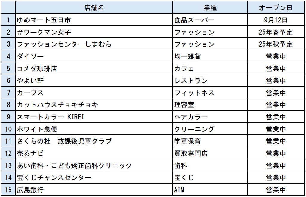 当施設は、交通の便がよい佐伯区の中心部に位置しており、当社が運営する食品スーパー「ゆめマート五日市」を中心にアパレル、レストラン、生活雑貨など多彩な専門店を一か所に集約したオープンモール形式の商業施設です。オープンモールの特性として、駐車場から店舗までの距離が近く、安全で便利なショートタイムショッピングを実現いたします。