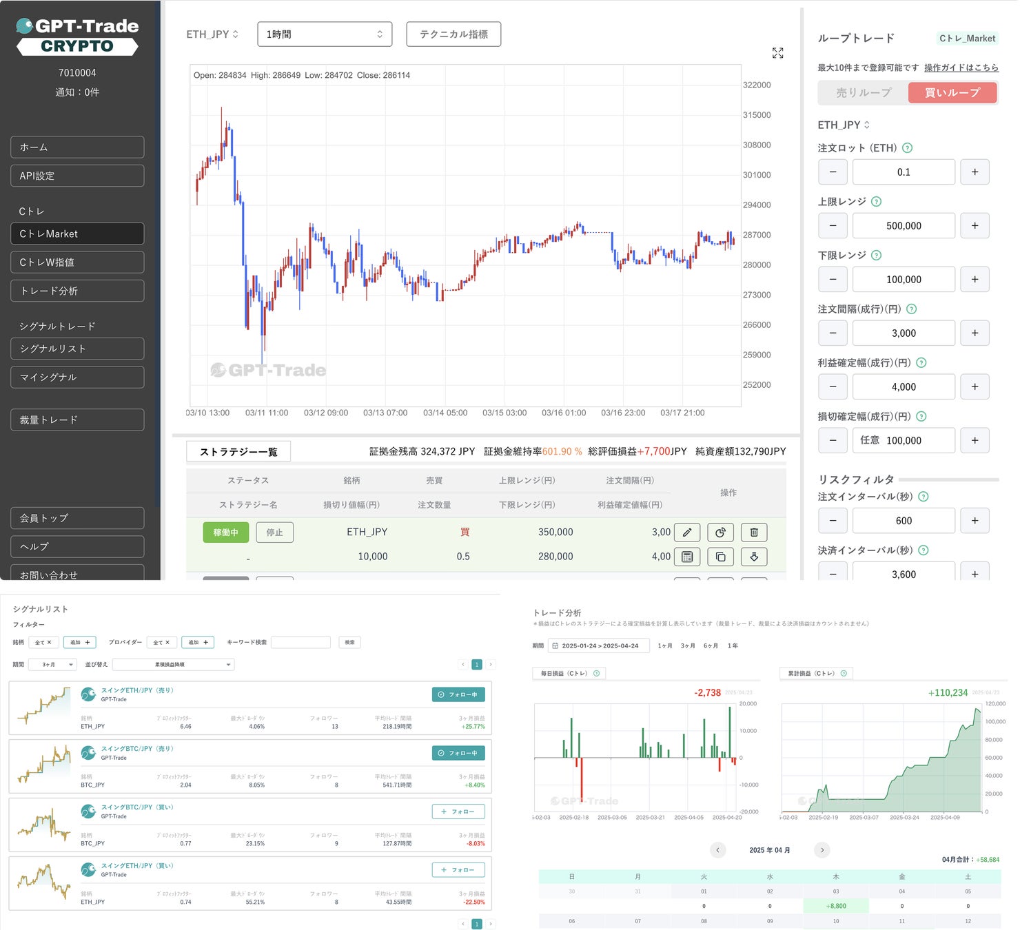 「GPT-Trade」は暗号資産の投資に対応した一般投資家向けの売買シグナル提供サービスです。AIをベースにトレードアドバイザリーテクノロジーズが独自に構築した投資ストラテジープログラムが、投資に関する各種統計データやリアルタイムの価格変動を分析し、投資家の投資スタイル・スタンスに応じた売買シグナルを生成します。比較的価格変動率の高い暗号資産市場において、24時間365日リアルタイム分析を行うため、生成されたシグナルを基に迅速な投資判断を可能とし、投資スタンスにマッチした期待収益の確保と価格変動リスクの最小化をサポートします。