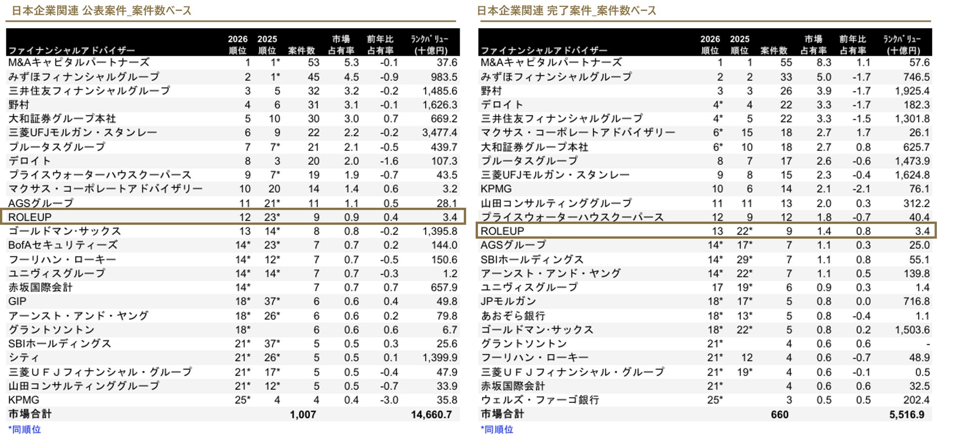 【株式会社ROLEUP】M&Aリーグテーブル「日本M&Aレビュー2026年(1‐3月期)」にて、日本企業関連公表案件数ベース12位、完了案件数ベース13位にランクイン