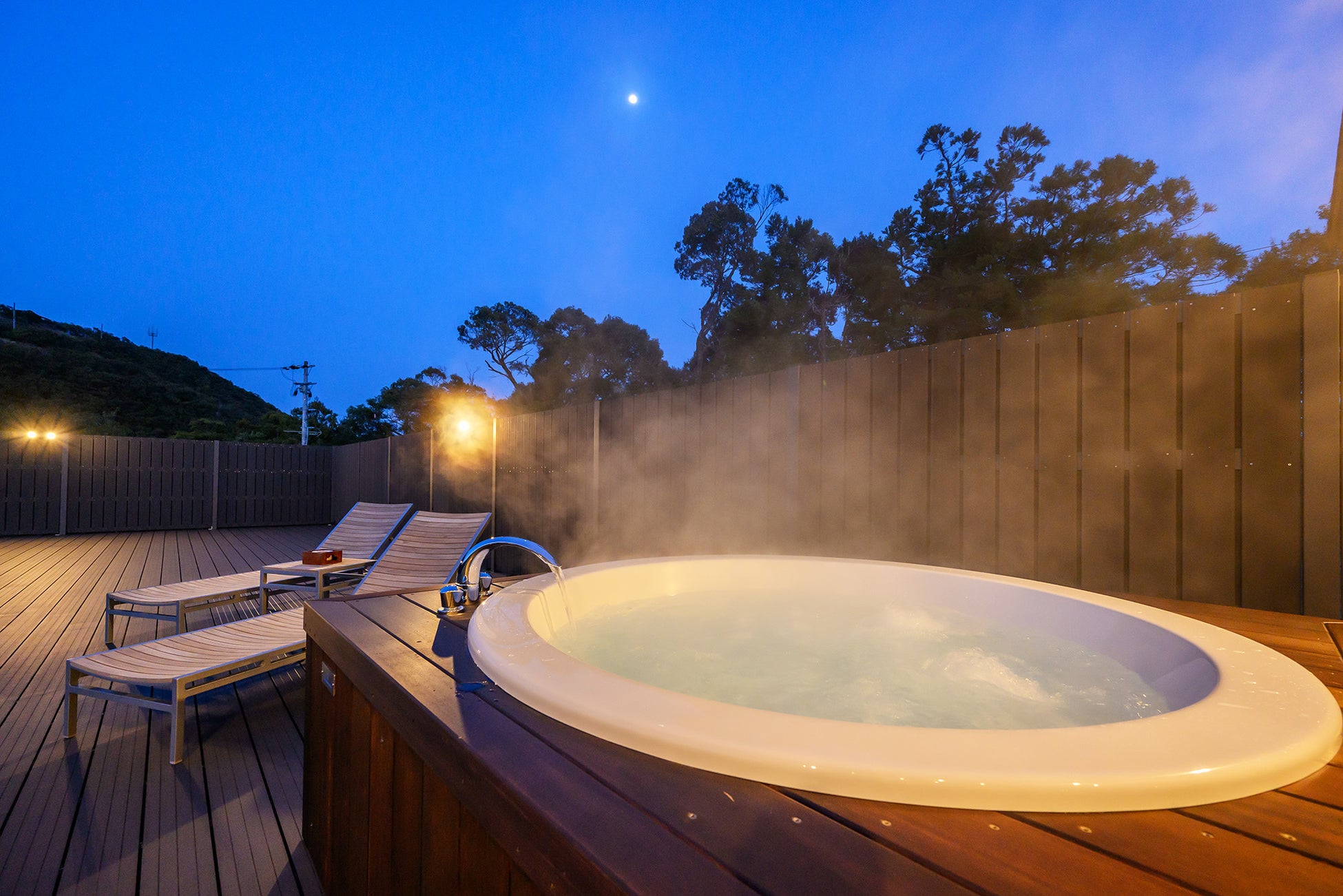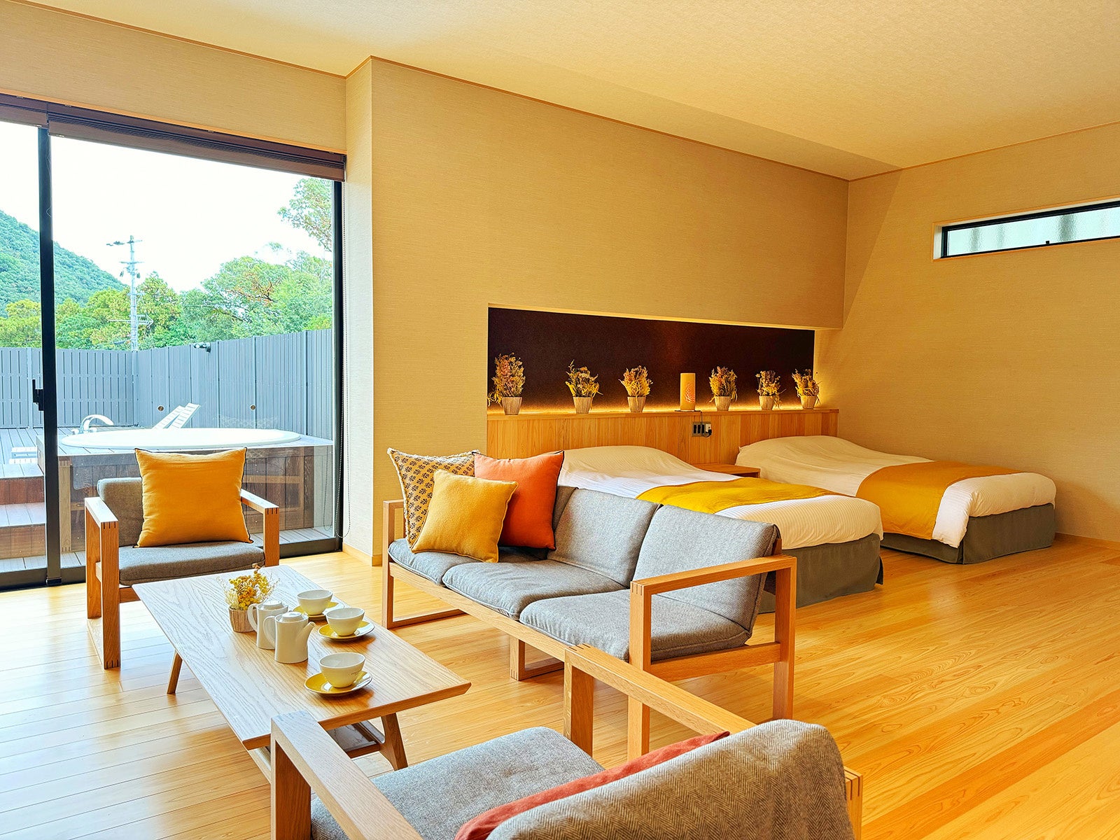 2024年4月に新設した、74平米の広さを誇る極上スイートルーム。室内はあたたかみあふれる竹あかりで照らされ、やわらかな光と自然のぬくもりを感じていただける、とてもゆったりとした空間です。110平米のテラスには、ジェットバス付露天風呂を備えています。ドライヤー・ヘアアイロン、シャワーヘッドは、すべて人気のReFa製品をご用意しています。