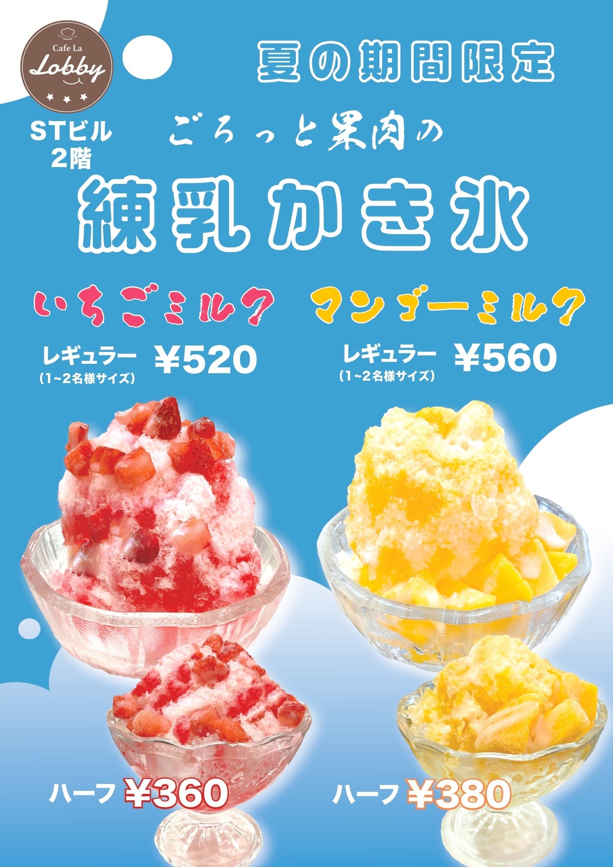 いちごミルクとマンゴーミルクの2種類のかき氷にそれぞれレギュラーとハーフの2種類のサイズをご用意しました。マンゴーはごろっともっちりとした味わい、いちごはつぶつぶ感を楽しみつつ程よい酸味と練乳の甘さとの相性が抜群です。