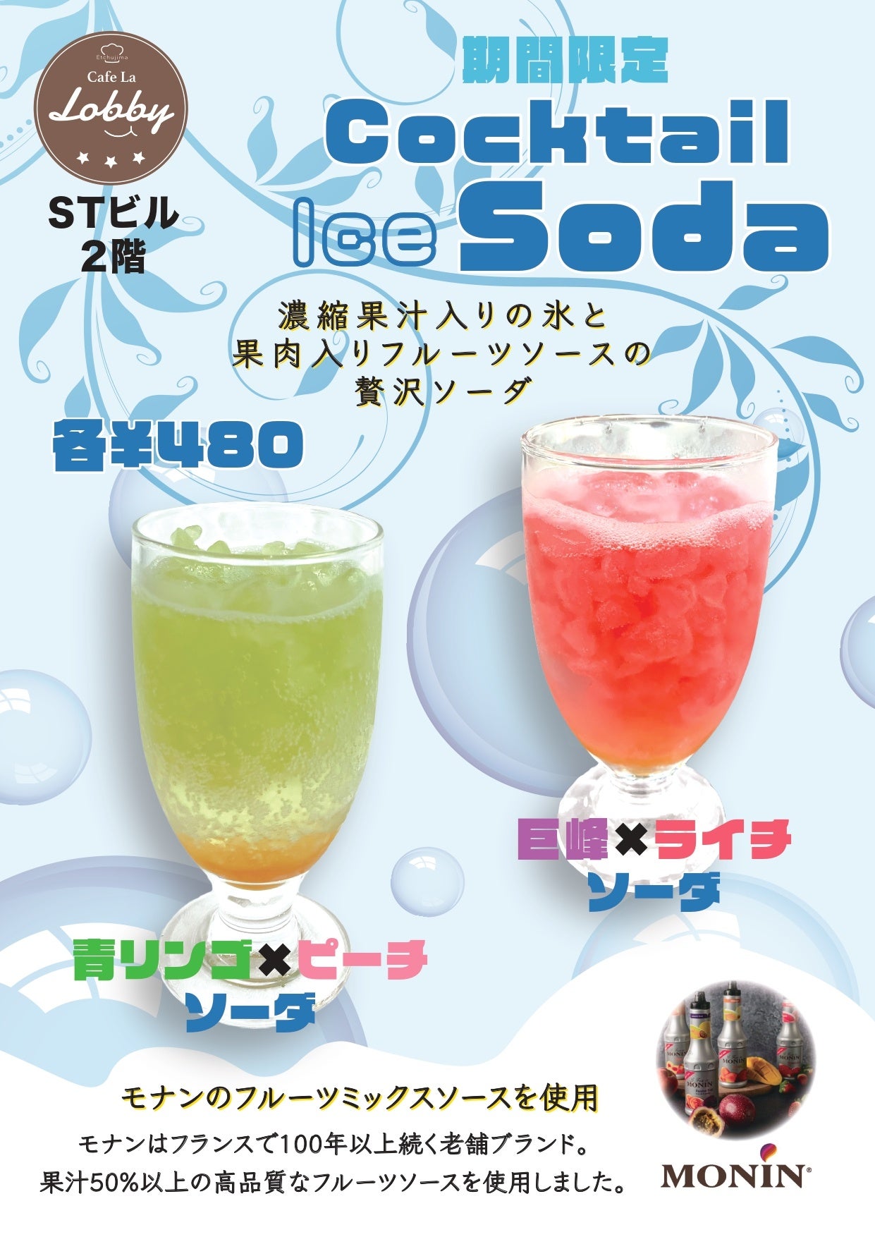 フランスの老舗シロップメーカー「モナン」のソースを使用したカクテルアイスソーダです。見た目の美しさだけでなく、果肉入りのフルーツソースたっぷりのぜいたくなソーダ。濃縮果汁入りの氷まで食べておいしくシャリシャリ感を楽しめます。アルコールは入っていませんので、お子さまでも召し上がれます。