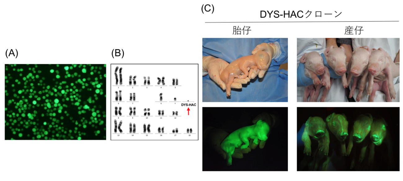 (C) 体細胞クローニングにより作出されたDYS-HACクローン胎仔 (左)と産仔 (右) DYS-HACクローンブタでGFPが観察され、DYS-HACベクターが全身に導入されていることを確認しました。