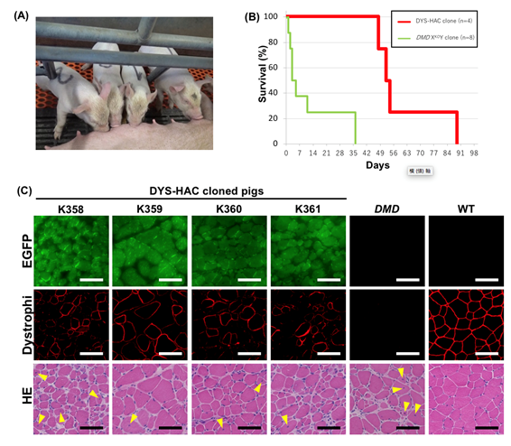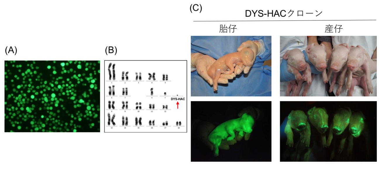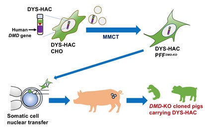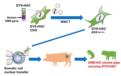 MMCT法により、ヒトジストロフィン人工染色体 (DYS-HAC)をデュシェンヌ型筋ジストロフィーのブタの線維芽細胞へ導入し、これを核ドナーとした体細胞クローニングにより、DYS-HACクローンブタが作出されました。