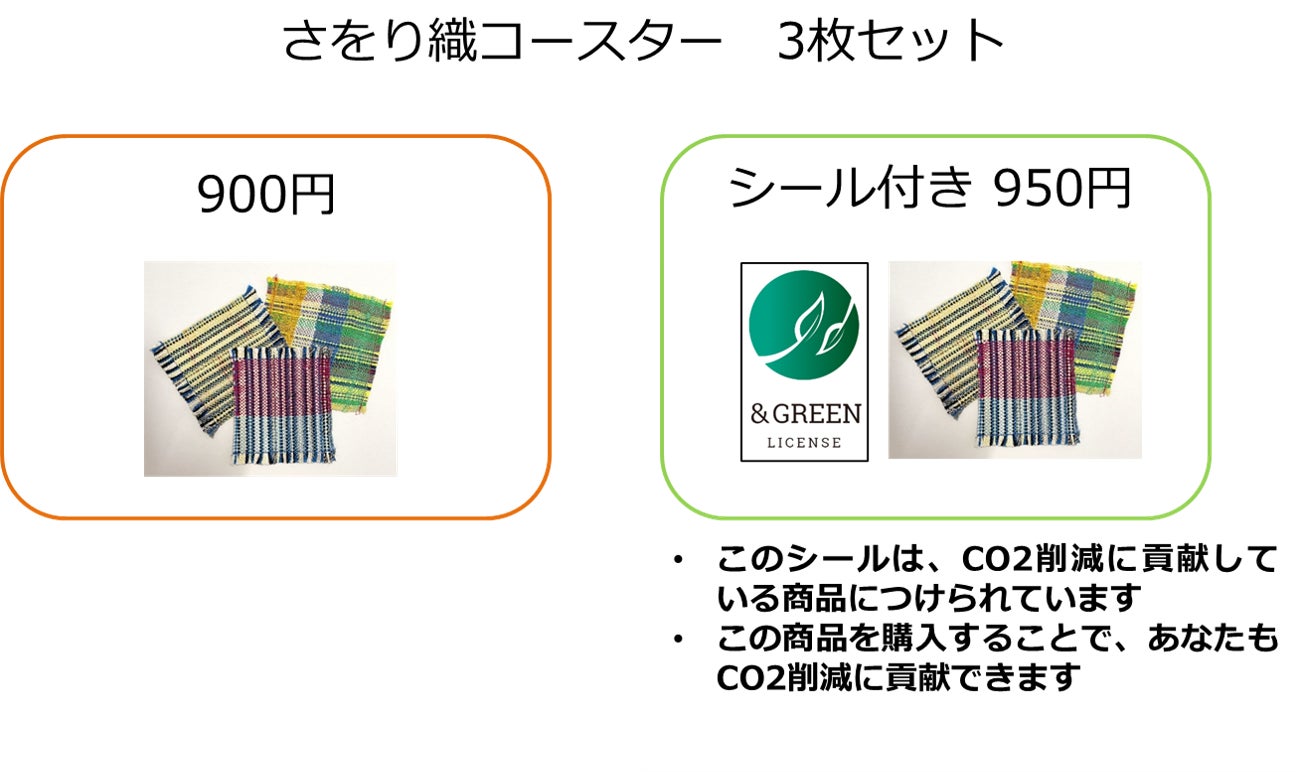 また、同じく横浜市にある、知的障害者や援助を必要とする方の生活支援する社会福祉法人すみなす会にもご協力いただき、同作業所で、使わなくなった糸を活用して作った循環型さをり織りコースターにグリーンシールを付けて、同カフェで通常品と並べて販売する実験も始めました。