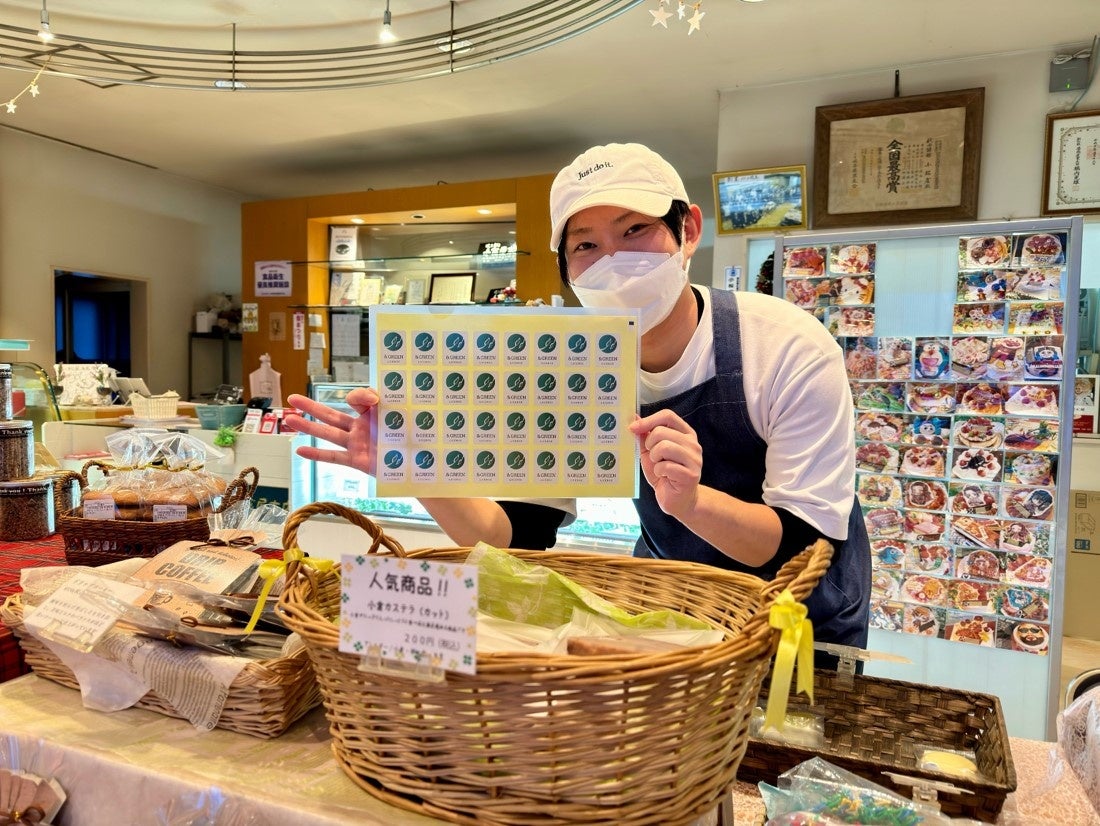 秋田県横手市では、自治体の協力を得て、実験に参加いただく企業に集まっていただいています。その中の一つ、小松屋菓子店でも、グリーンシールを貼った商品の販売を開始しました。