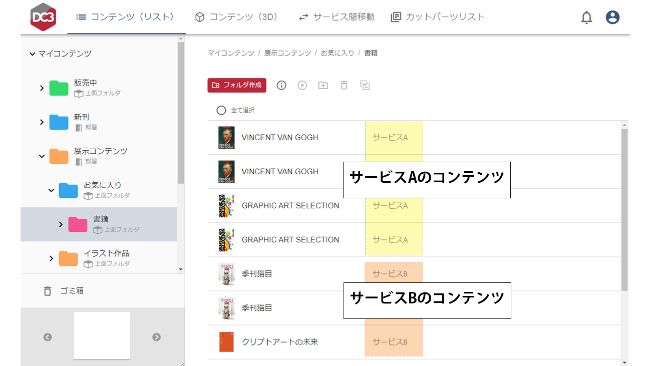 DC3マイルームのコンテンツ管理機能では、自身の保有するDC3コンテンツを、サービスを横断して確認・整理することが可能です。DC3マイルームから各サービスを介してコンテンツを再生することもできます。