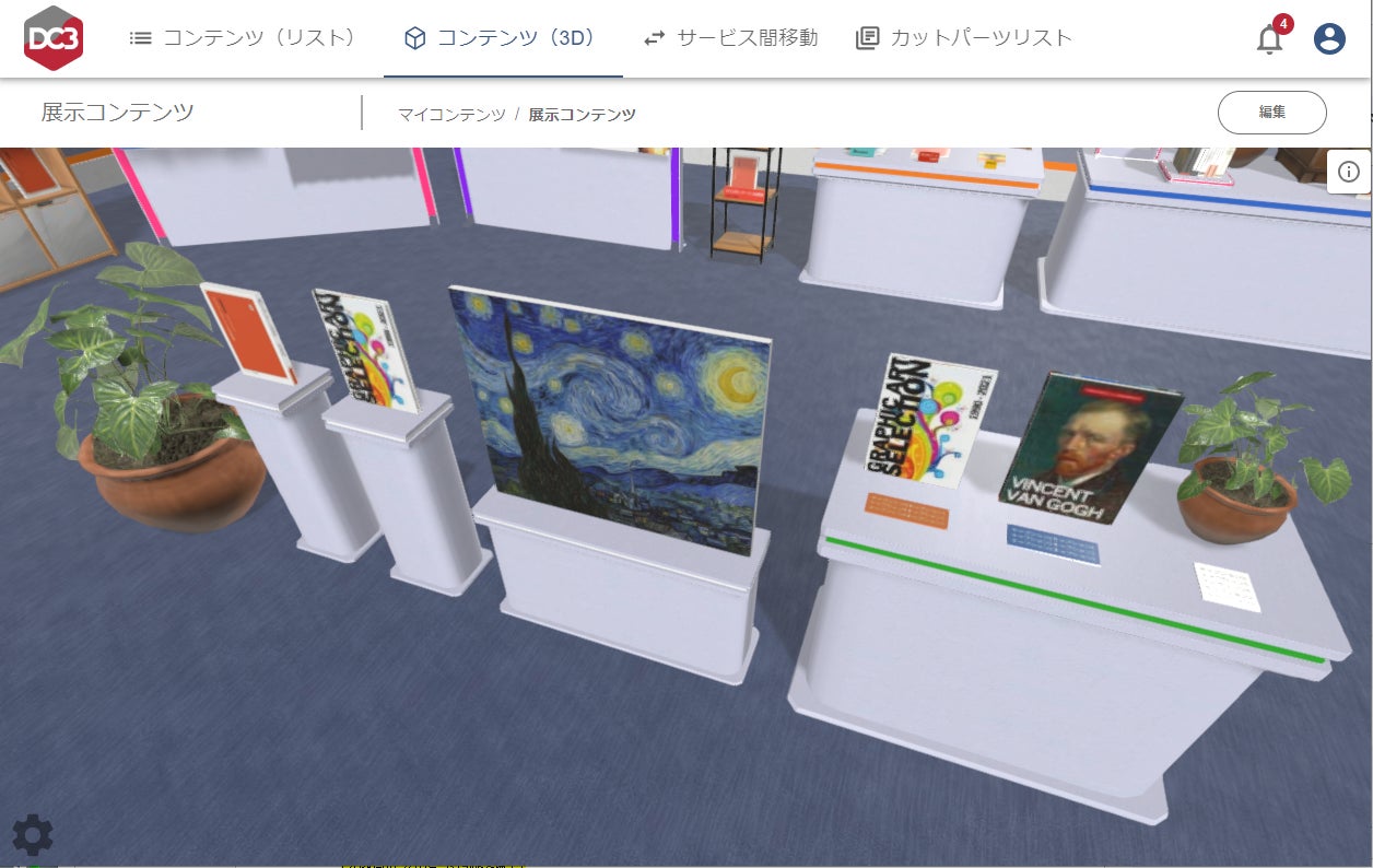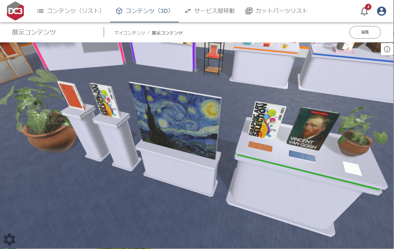 さらに、DC3マイルームには自身が保有するコンテンツを3D空間にディスプレイし、ウォークスルーする機能があります。また、その3D空間のURLを発行し、外部に公開することも可能です。