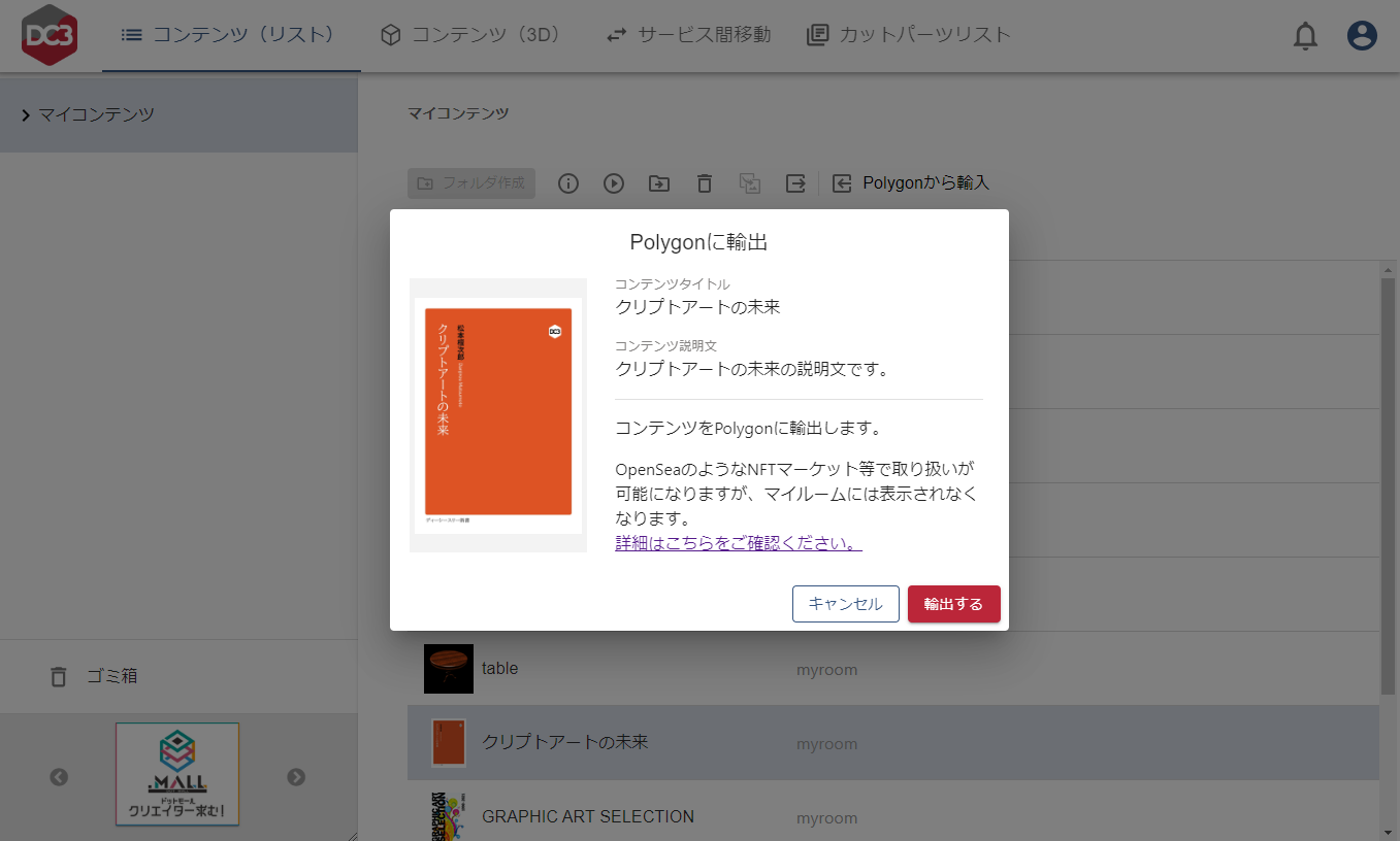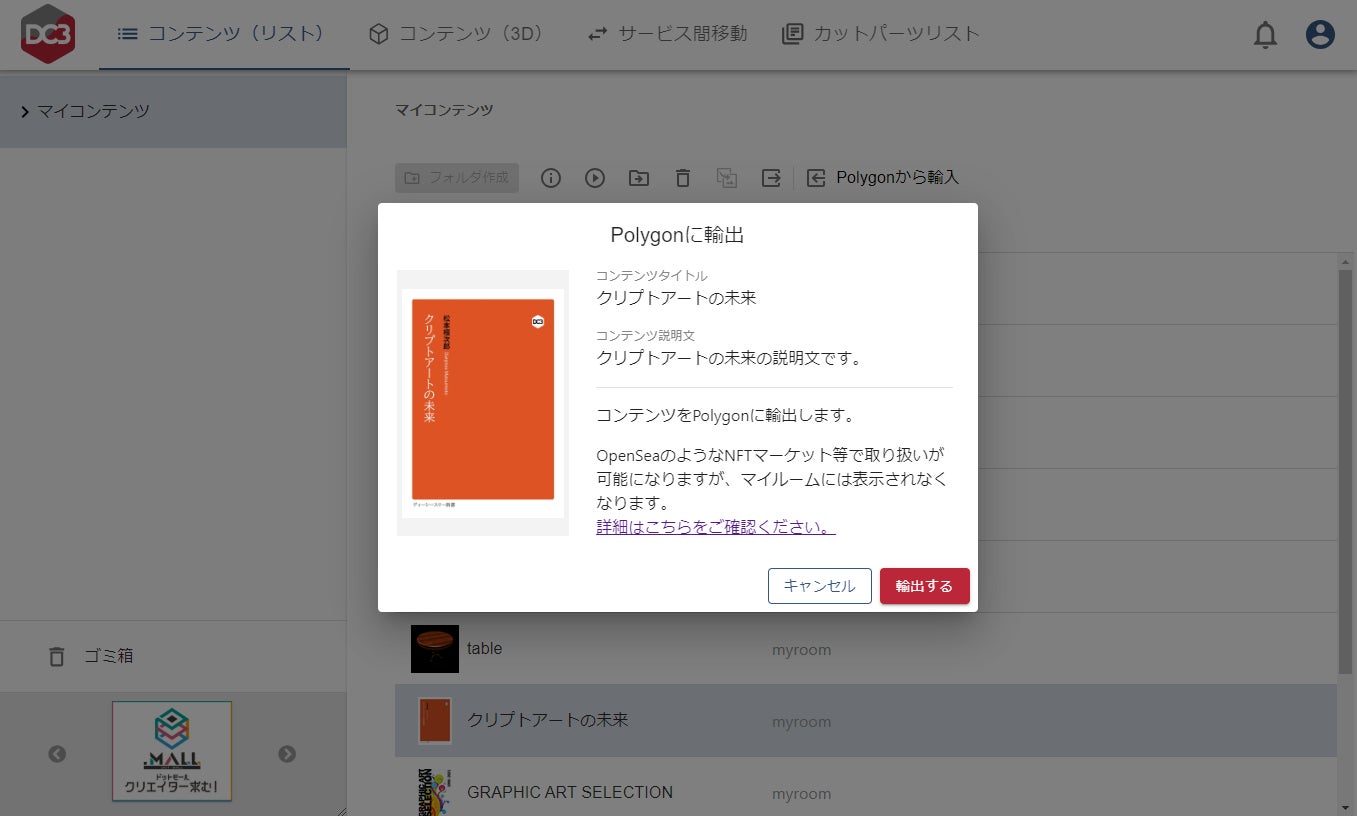 DC3マイルームとPolygonを連携させることが可能になり、自身が保有するDC3コンテンツをNFTとしてPolygonに輸出したり、一度輸出したコンテンツを再度DC3に輸入したりすることができます。