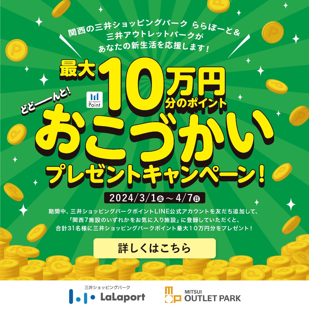 3月1日(金)~4月7日(日)には、三井ショッピングパークポイントLINE公式アカウント友だち追加+お気に入り施設登録いただいた方から抽選で31名様に三井ショッピングパークポイントを最大10万円分プレゼントするキャンペーンも開催します。